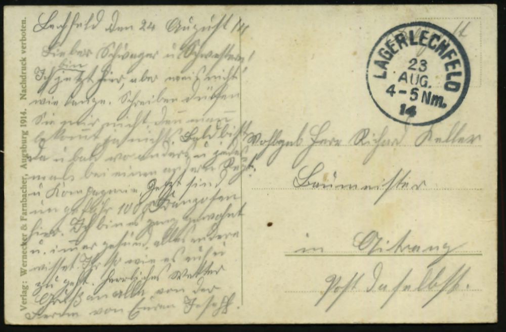 232 | 15 € | TRUPPENÜBUNGSPLÄTZE bis 1918 : LECHFELD LAGER 1914 (23.8.) 1K (gr. Buchstaben, 180° ohne Lücke) auf Color-Foto-Ak.: Gruss vom Truppenübungsplatz Lager Lechfeld (aus der Vogelschau mit Alpen) klar gest., f r ü h e Feldpost-Kt. n. Aitrang | ![]() ![]() | |