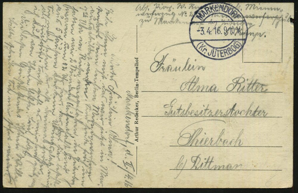 246 | 18 € | TRUPPENÜBUNGSPLÄTZE bis 1918 : Markendorf 1916 (Apr./Sept.) 1K-BRÜCKE: MARKENDORF/(Kr. JÜTERBOG ohne UB bzw. mit UB "a" auf s/w.-Foto-Ak.: Truppen-Uebungsplatz Markendorf Wirtschaftsgebäude (links Randkerbe) + hs. Abs.: "..Minenwerferzug.." bzw. individuelle s/w.-Foto-Ak.: "Erinnerung an die 9. KOMP. 1916" (Gruppenfoto), je glasklar gest. Feldpost-Kt., 2 Belege (Einzelausruf möglich: je 10.- EUR) | ![]() ![]() ![]() ![]() | |