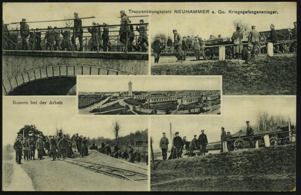 272 | 15 € | TRUPPENÜBUNGSPLÄTZE bis 1918 : NEUHAMMER/ *(QUEIS)/ a 1916 (1.3.) 1K-Brücke + hs. Abs.: "5. A. K. Neuhammer.." auf s/w.-Foto-Ak.: Truppenübungsplatz, Kriegsgefangenenlager (Russen bei der Arbeit, 5 Ansichten) klar gest. Feldpost-Kt. n. Bln-Westend (Uhv. Ansichtskartenverlag "Silesia", Görlitz) | ![]() ![]() | |