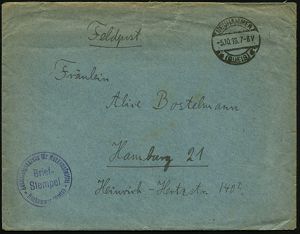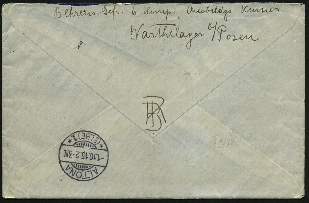 314 | 25 € | TRUPPENÜBUNGSPLÄTZE bis 1918 : WARTHELAGER/ TRUPPEN-/ ÜBUNGSPLATZ 1915 (30.9.) 1K-Brücke = Hauspostamt Truppen-Übungsplatz, 7 x auf 7x 5 Pf. Germania , klar gest. Fern-Eil-Bf. + Inhalt: Text über das Lager- u. Ausbildungsleben! n. Altona, 2 Belege kompl.! (Mi.85 MeF) | ![]() ![]() | |