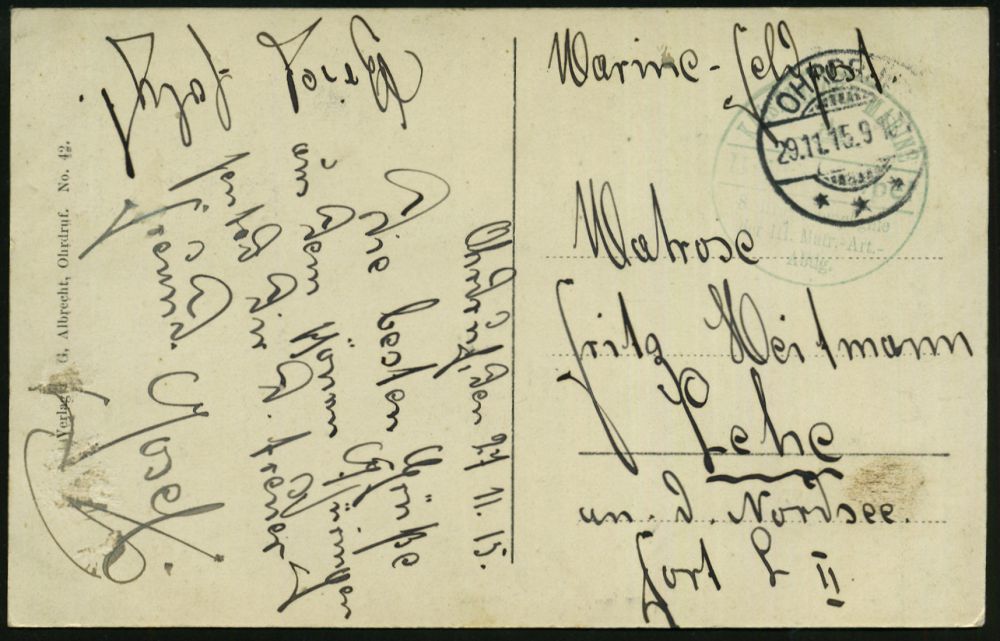 279 | 12 € | TRUPPENÜBUNGSPLÄTZE bis 1918 : OHRDRUF/ *** 1915 (29.11.) 1K-Gitter + grüner 1K-HdN.: KAISERLICHE MARINE/...III. Matr(osen).-Art.(illerie)/Abtlg. auf s/w.-Foto-Ak.: Truppenübungsplatz Ohrdruf, Feldpost-Kt. (kl. Eckfleckchen) an Marine-Fort Lehe | ![]() ![]() | |
