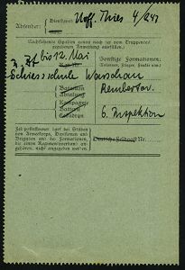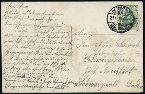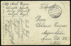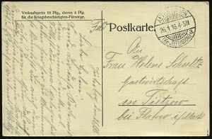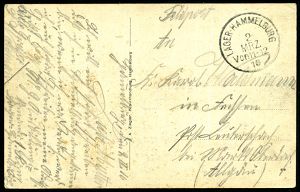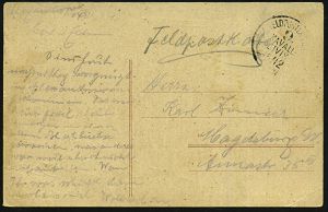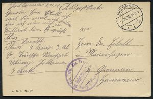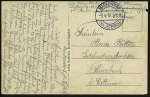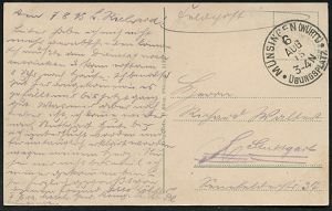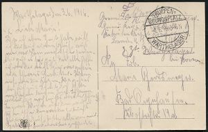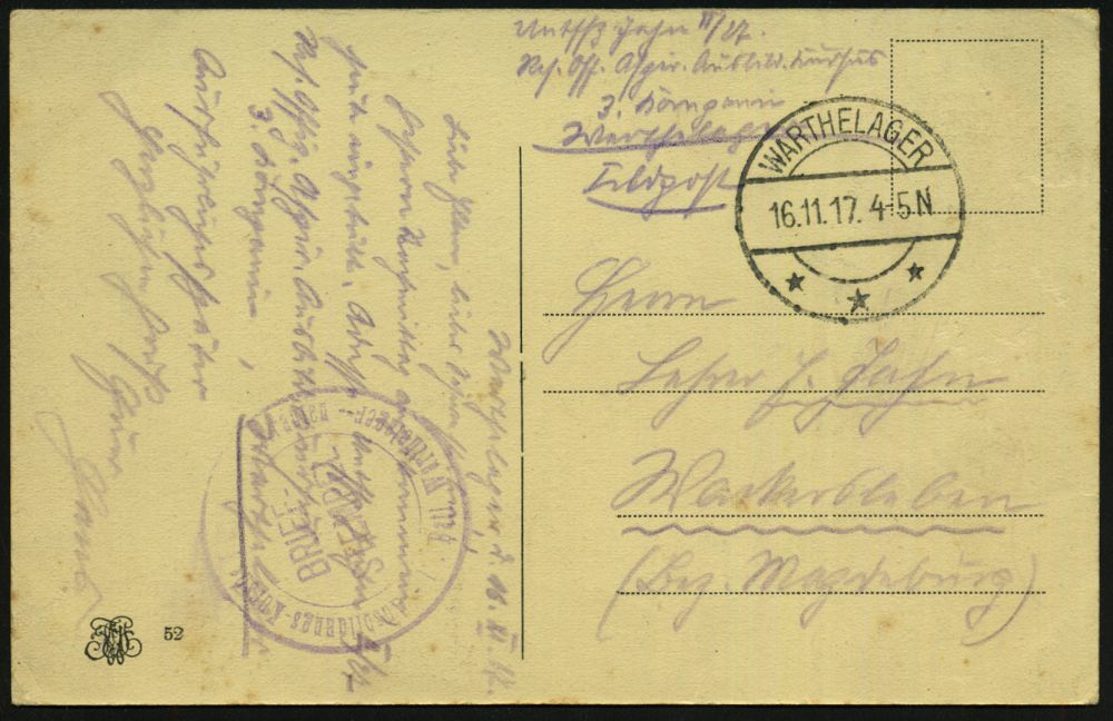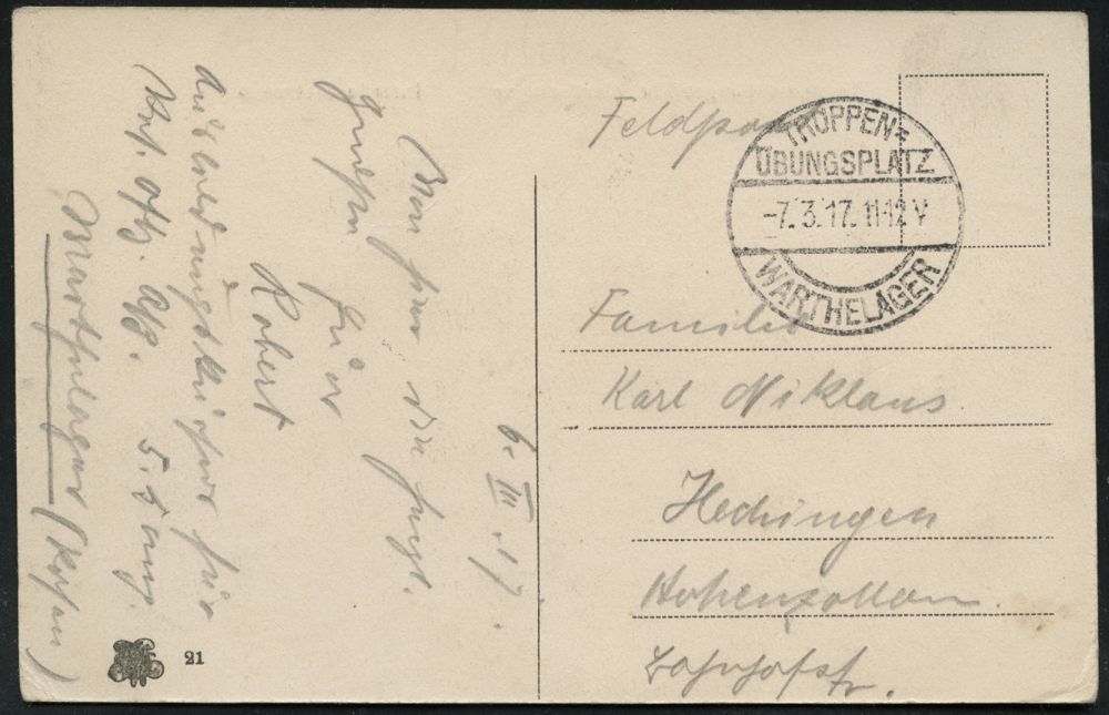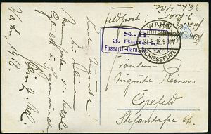 319 | 16 € | TRUPPENÜBUNGSPLÄTZE bis 1918 : WARTHELAGER/ *** 1917 (16.11.) 1K-Brücke, neue Form (nur ca. 1 1/2 Jahre verwendet) = Hauspostamt Truppenübungsplatz + viol. 2K-HdN: Ausbildungs-Kursus.. Offiz. Aspiranten/ Warthelager + hs. Abs. , monochrome Foto-Feldpost-Ak.: Truppenübungsplatz Warthelager.., | ![]() ![]() | |