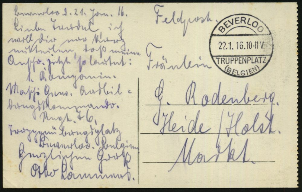 334 | 14 € | TRUPPENÜBUNGSPLÄTZE bis 1918 : DT.BES.BELGIEN 1916 (22.1.) 1K-Brücke: BEVERLOO/TRUPPENPLATZ/(BELGIEN) + hs. Abs.: "..Ausbildungskommando Regt. 76.." , glasklar gest. s/w.-Foto-Ak.: Camp de Beverloo La Glacière (Der "Gletscher" = Kühlraum) klar gest. Feldpost-Kt. (n. Heide/Holst) | ![]() ![]() | |