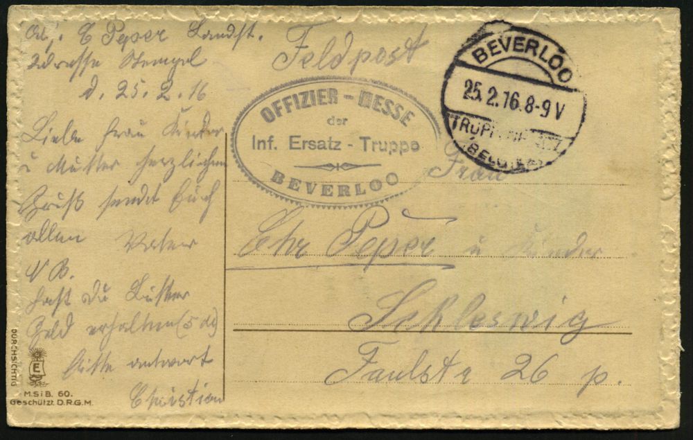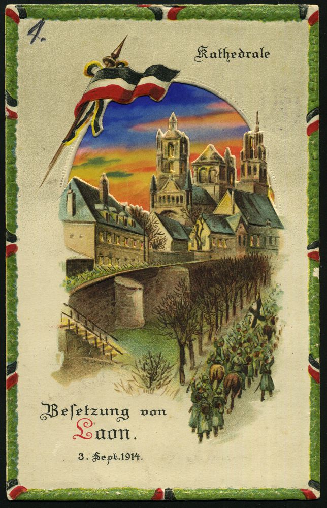 336 | 25 € | TRUPPENÜBUNGSPLÄTZE bis 1918 : DT.BES.BELGIEN 1916 (25.2.) 1K-Brücke: BEVERLOO/TRUPPENPLATZ/(BELGIEN) (gering undeutl.) + viol. Oval-HdN.: OFFIZIER-MESSE/der/Inf.Ers.-Truppe/ BEVERLOO auf dekorat., patriot. Colorlitho-Relief-Ak.: Besetzung von Laon 3. September/ Kathedrale = "Halte-gegen-das-Licht"- Feldpost-Kt. (n. Schleswig) | ![]() ![]() | |