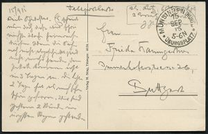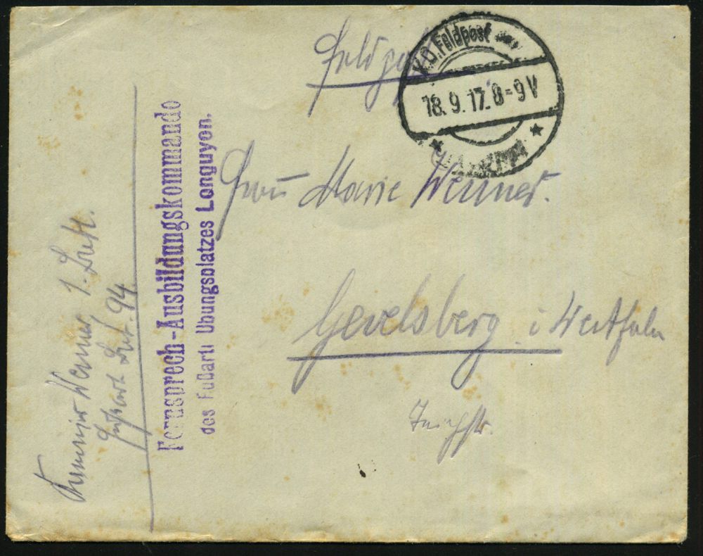 337 | 14 € | TRUPPENÜBUNGSPLÄTZE bis 1918 : DEUTSCHES REICH / FRANKREICH 1917 (18.9.) viol. 2L: Fernsprech-Ausbildungskommando/des Fußartl. Übungsplatzes Longuyon + apt. 1K: K. D. Feldpost/* *, kleiner Feldpost-Bf. (schwach fleckig) n. Gevelsberg | ![]() | |