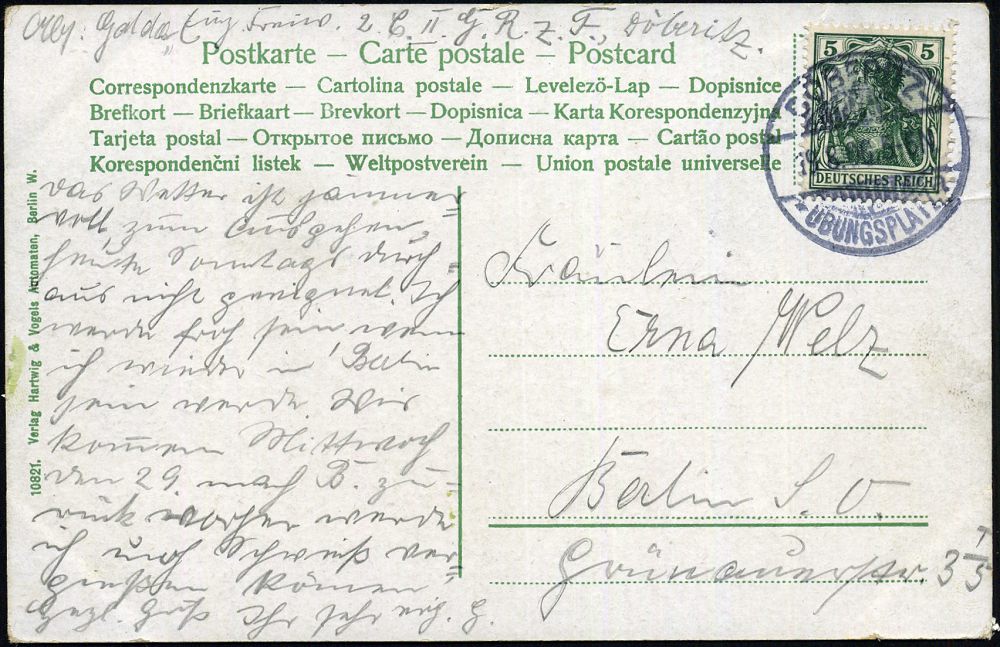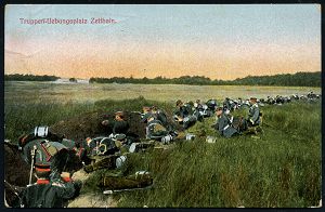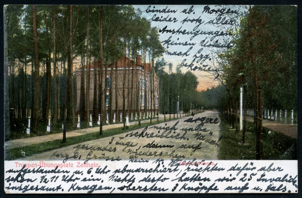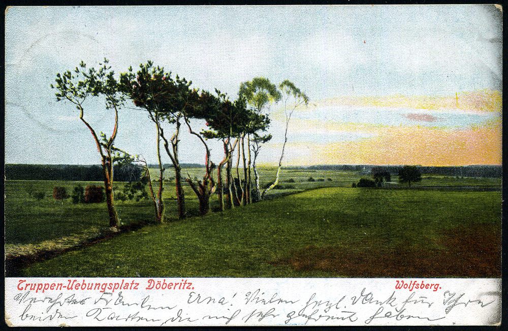 174 | 12 € | TRUPPENÜBUNGSPLÄTZE bis 1918 : DÖBERITZ-/ *ÜBUNGSPLATZ/ a 1906 (19.8.) 1K-Gitter = Hauspostamt Truppenübungsplatz + hs. Abs.: "2. C. II G. R. Z. F., Döberitz" , klar gest. Color-Foto-Ak.: Truppen-Uebungsplatz Döberitz Wolfsberg n. Berlin (Mi.85 I) | ![]() ![]() | |