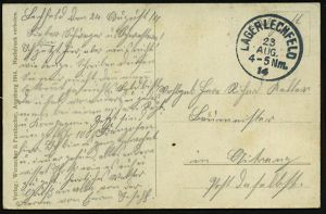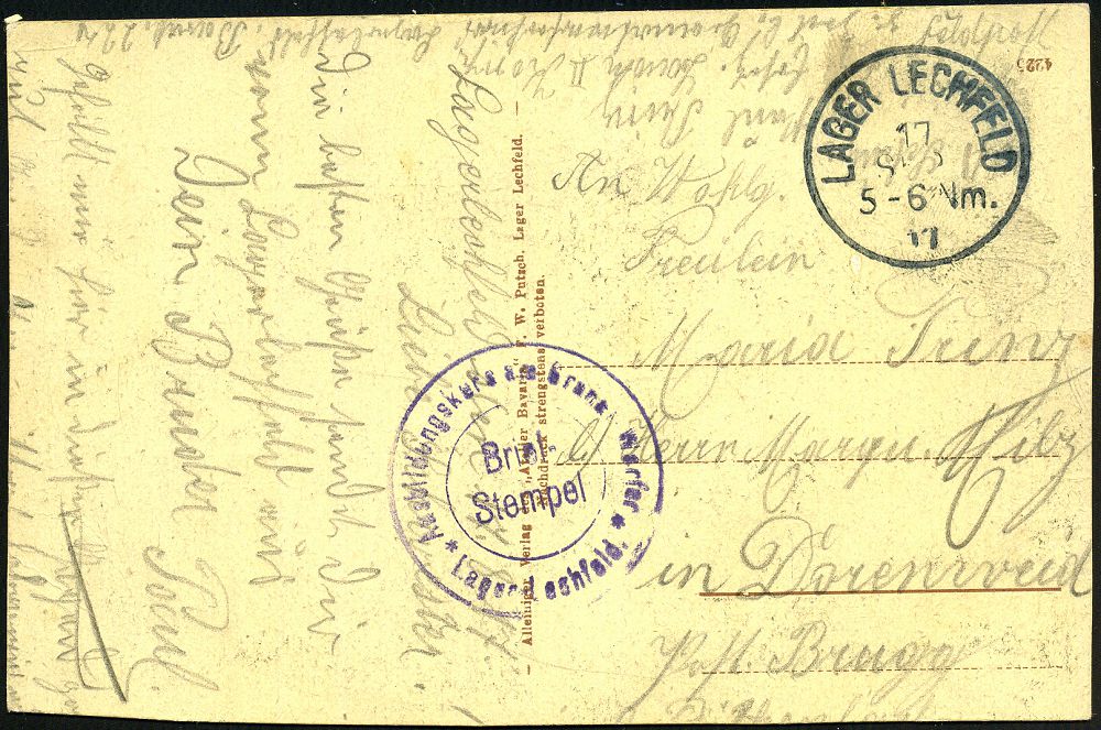 234 | 12 € | TRUPPENÜBUNGSPLÄTZE bis 1918 : LAGER LECHFELD 1917 (17.9.) 1K mit Lücke = Hauspostamt Truppenübungsplatz + viol. 2K-HdN: Ausbildungskurs am Granat-Werfer... + hs. Abs., klar gest. Color-Feldpost-Ak.: Mittlere Lagerstraße (kl. Eckspuren) n. Dorenweid | ![]() ![]() | |