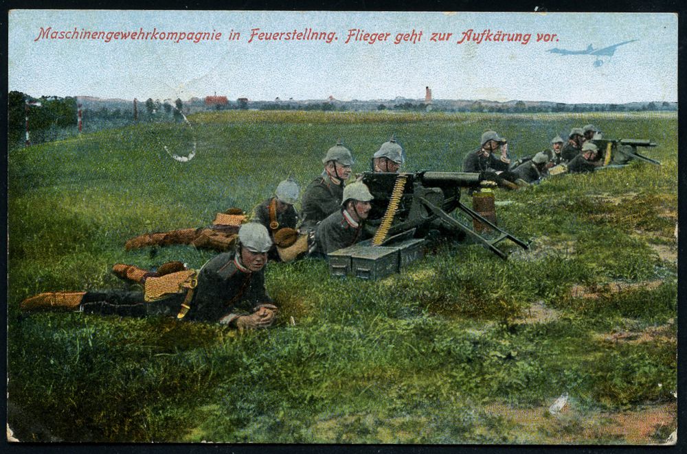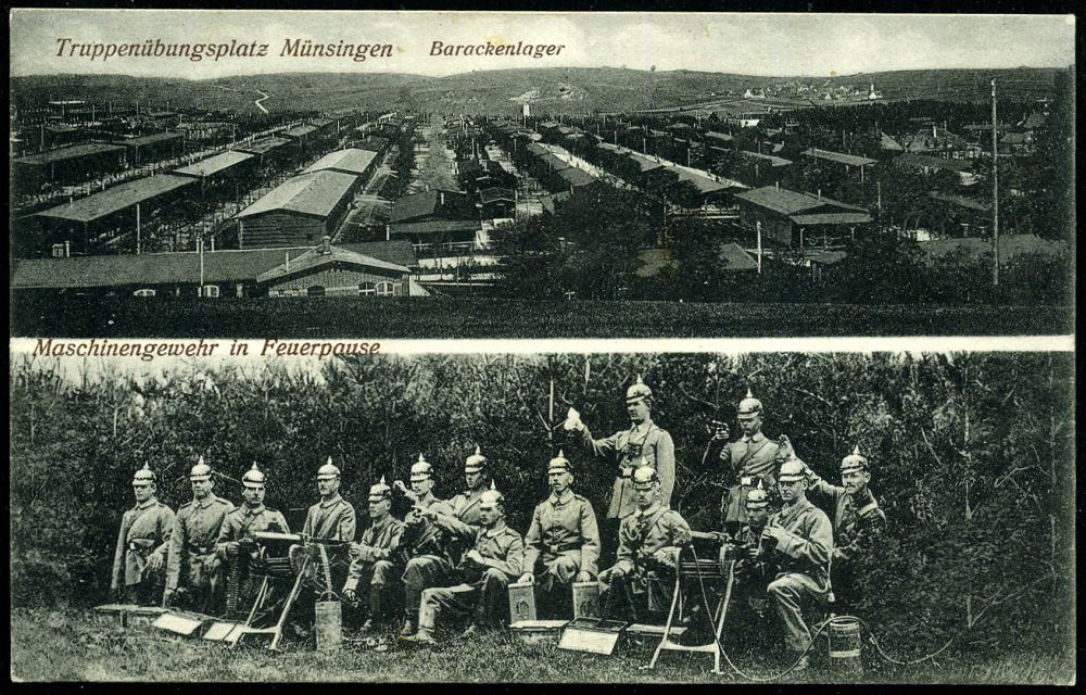 262 | 14 € | TRUPPENÜBUNGSPLÄTZE bis 1918 : MÜNSINGEN (WÜRTT.)/ *ÜBUNGSPLATZ* 1915 (23.7.) 1K mit Punkten (ehem. Sterne) + hs. Abs.: ".. 1. M.G. K.(omp.) XIII, AK." auf passender s/w.-Foto-Ak.: Truppenübungsplatz Münsingen.. Maschinengewehr in Feuerpause (2 Ansichten) Feldpost-Kt. | ![]() ![]() | |