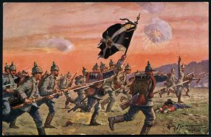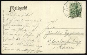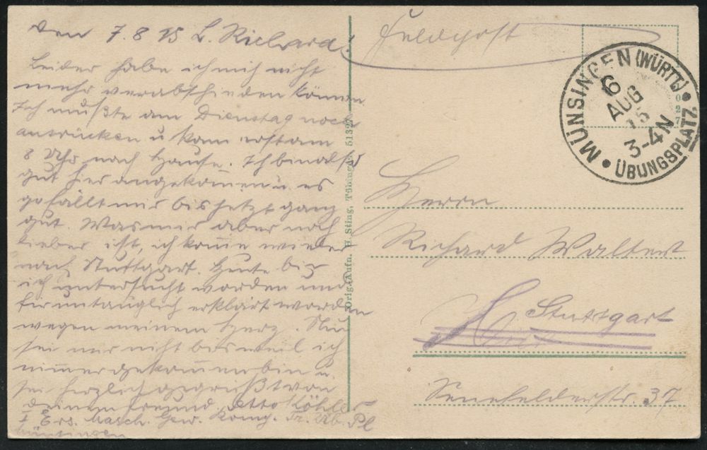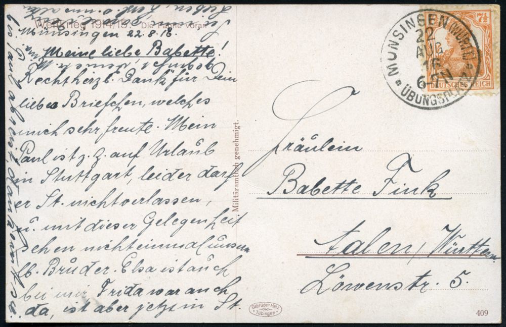 263 | 15 € | TRUPPENÜBUNGSPLÄTZE bis 1918 : MÜNSINGEN (WÜRTT.)/ *ÜBUNGSPLATZ* 1916 (22.8.) 1K mit vierteiligem Stern = Hauspostamt Truppenübungsplatz auf EF Germania 7 1/2 Pf. auf patriotischer Color-Propaganda-Ak.: Die Fahne voran m. Künstler-Signatur n. Aalen (Mi.99 EF) | ![]() ![]() | |