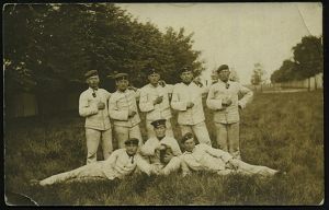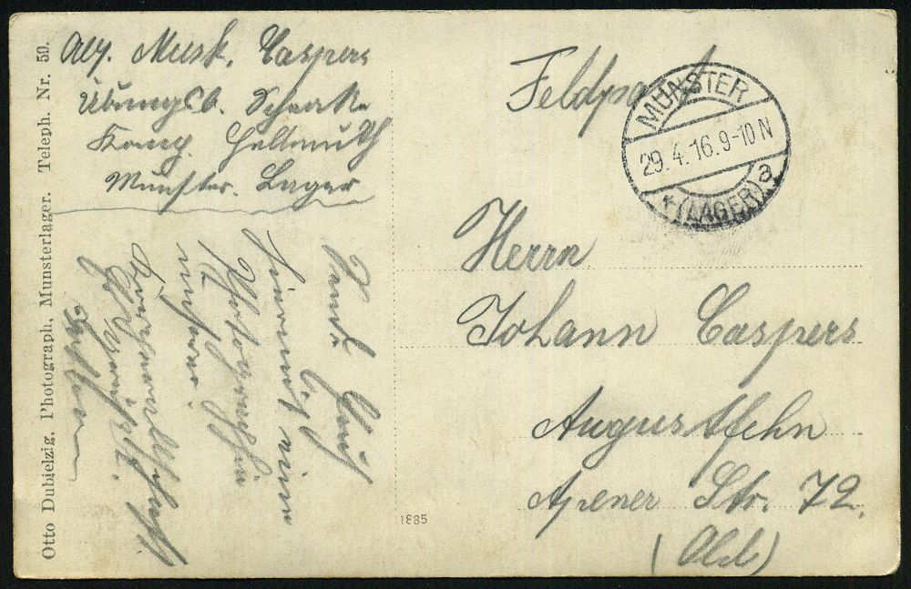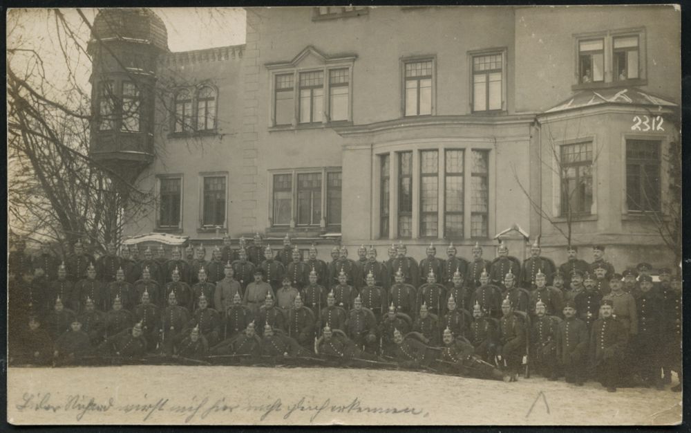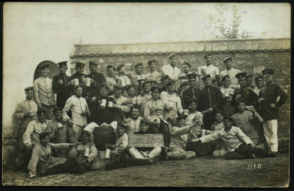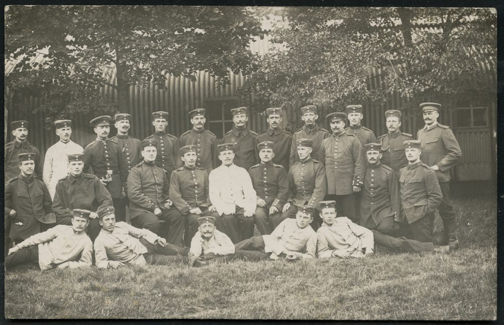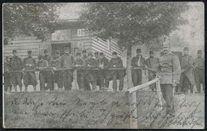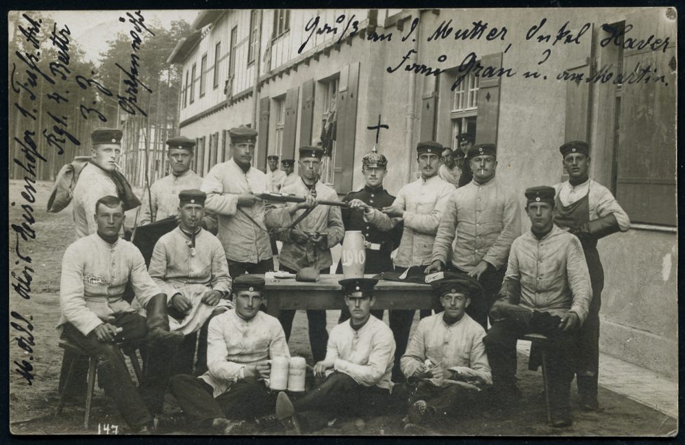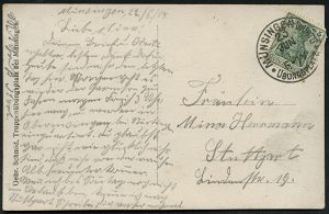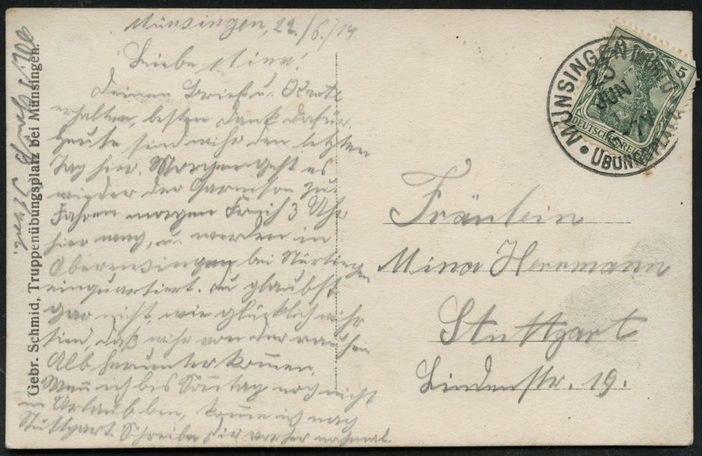 259 | 12 € | TRUPPENÜBUNGSPLÄTZE bis 1918 : MÜNSINGEN (WÜRTT)/ ° ÜBUNGSPLATZ ° 1914 (23.6.) 1K mit vollen Punkten (ehem. Sterne) = Hauspostamt Truppenübungsplatz auf EF 5 Pf. Germania, individuelle s/w.-Foto-Ak.: "Heimats-Brüder in Schwäb. Sibirien" (Gruppenfoto teils mit Bierkrügen, Bedarf n. Stuttgt., kurz vor dem I. Weltkrieg | ![]() ![]() | |
