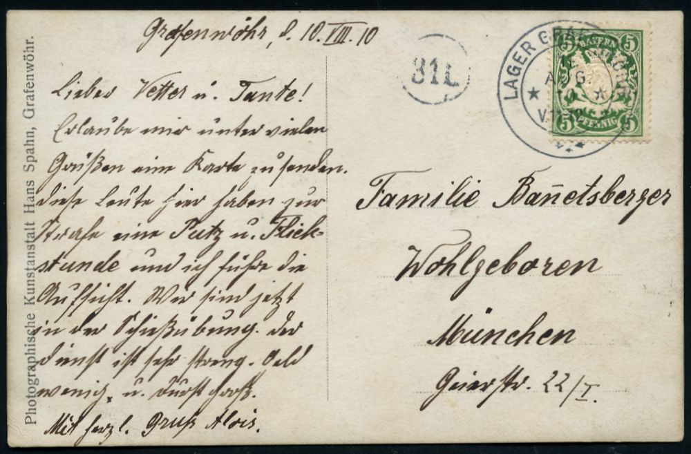 183 | 14 € | TRUPPENÜBUNGSPLÄTZE bis 1918 : GRAFENWÖHR LAGER/ ** 1910 (11.8.) 2K mit Zierstück unten = Hauspostamt Truppenübungsplatz auf Bayern 55 Pf. Wappen, individuelle s/w.-Foto-Ak.: Soldatengruppe mit Karabiner, Bierkrügen etc. (Uhv.: Photogr. Kunstanstalt Hans Spahn, Grafenwöhr), Bedarf (Mi.61) | ![]() ![]() | |