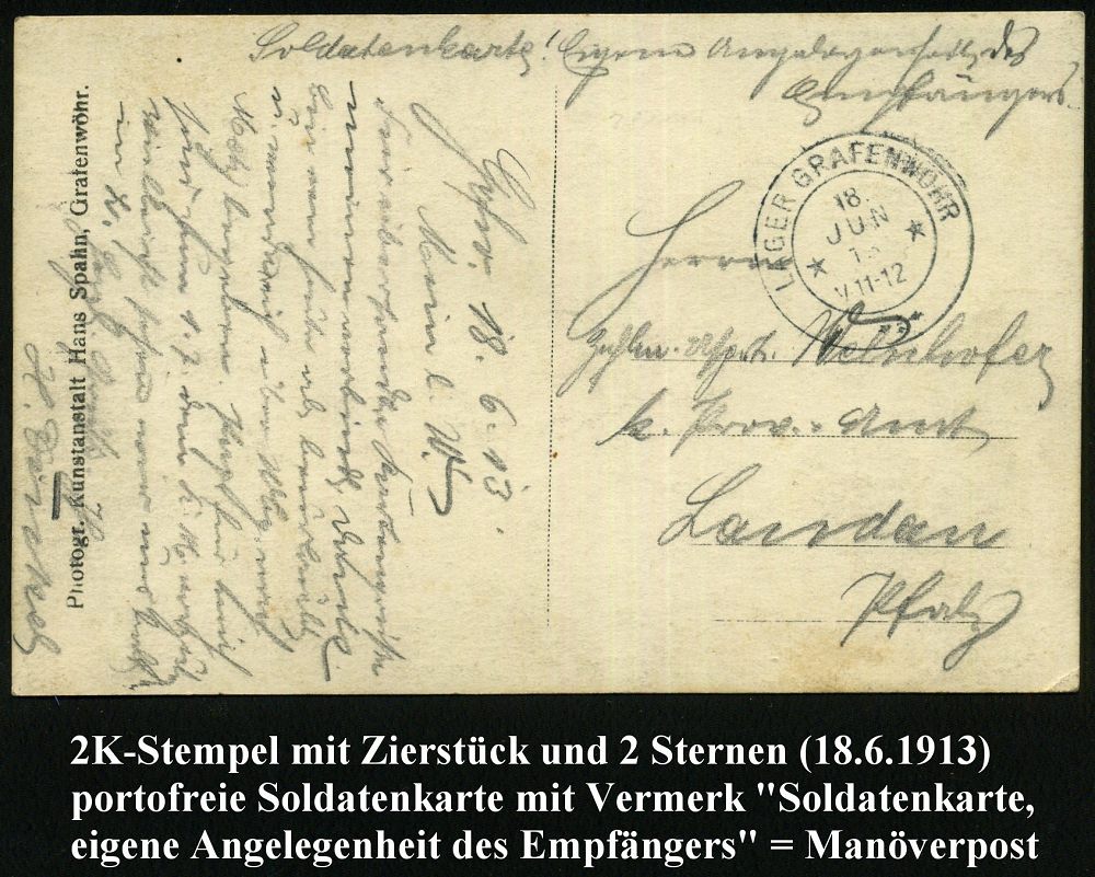 184 | 14 € | TRUPPENÜBUNGSPLÄTZE bis 1918 : GRAFENWÖHR LAGER/ ** 1913 (18.6.) 2K mit Zierstücken unten + hs. Vermerk: "Soldatenkarte eigene Angelegenheit des Empfängers" auf individueller s/w.-Foto-Ak.: Offiziere mit Bierkrügen, klar gest. portofreie Manöver-Kt. n. Landau | ![]() ![]() | |