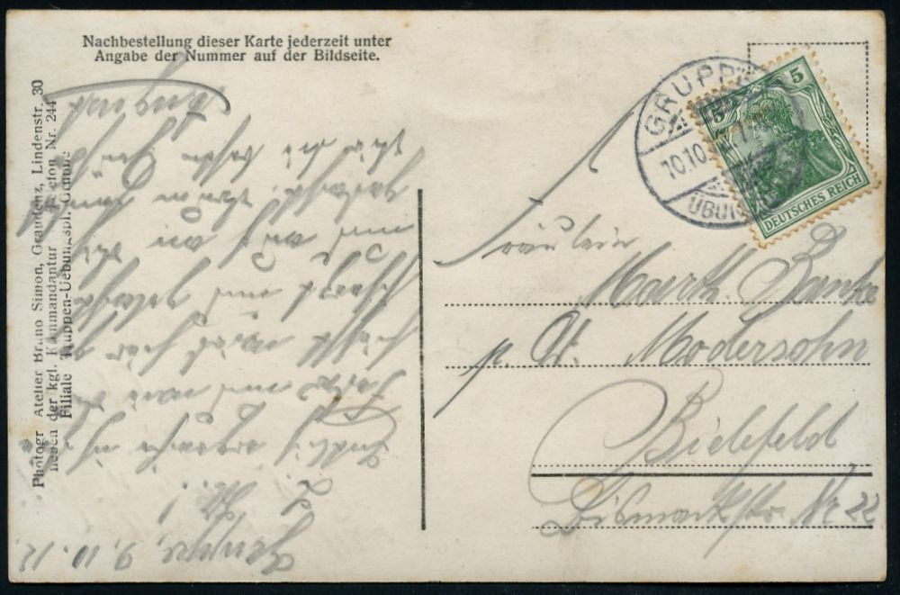 191 | 18 € | TRUPPENÜBUNGSPLÄTZE bis 1918 : GRUPPE/ ÜBUNGSPLATZ 1912 (10.10.) seltener 1K-Gitter = Hauspostamt Truppenübungsplatz auf individueller s/w.-Foto-Ak.: Reserve-Übuzng, Soldaten im Flugzeug (Uhv.: Atelier-Foto Bruno Simon, Graudenz) Bedarfs-Kt. n. Bielefeld (Mi.85) | ![]() ![]() | |