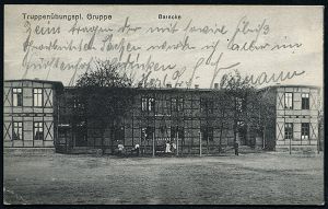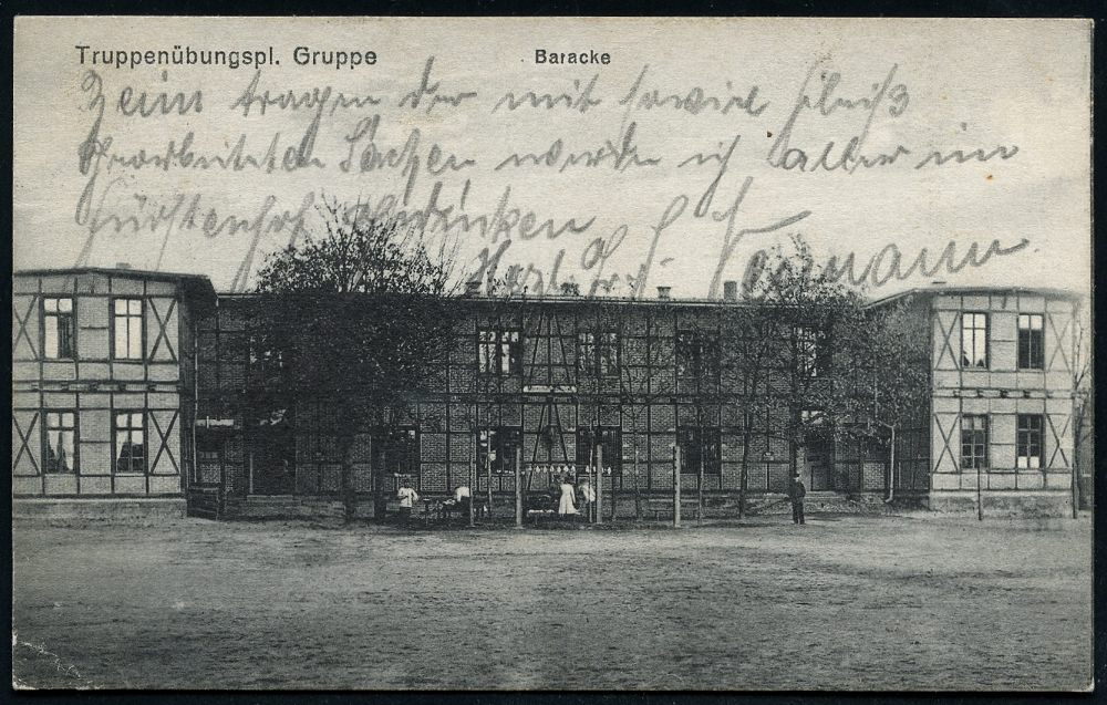 192 | 18 € | TRUPPENÜBUNGSPLÄTZE bis 1918 : GRUPPE/ ÜBUNGSPLATZ 1916 (2.11.) seltener 1K-Gitter = Hauspostamt Truppenübungsplatz + hs. Abs. auf s/w.-Foto-Feldpost-Ak.: Baracke n. Berlin (Uhv.: Verl. H. Dessonneck, Graudenz) | ![]() ![]() | |