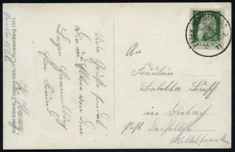 196 | 12 € | TRUPPENÜBUNGSPLÄTZE bis 1918 : HAMMELBURG LAGER 1911 (29.8.) 1K (schmale Buchstaben) = Hauspostamt Truppenübungsplatz auf individueller s/w.-Foto-Ak.: große Soldatengruppe im Feld (Uhv. Nr.372, Atelier Alberti, Hammelburg 1911) klar gest. Bedarf n. Diebach (Mi.77) | ![]() ![]() | |