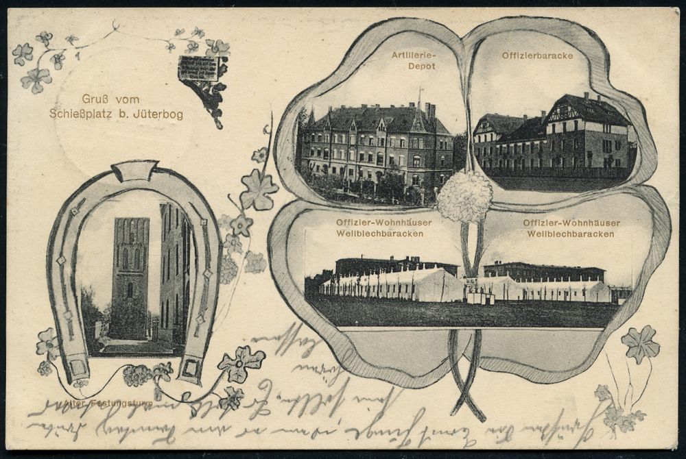 207 | 15 € | TRUPPENÜBUNGSPLÄTZE bis 1918 : Jüterbog 1911 (5.7.) 1K-Gitter: ALTES LAGER/(Kr.JÜTERBOG)/a = Hauspostamt Truppenübungsplatz klar auf s/w.-Foto-Ak.: Gruß vom Schießplatz b. Jüterbog (5 Ansichten inkl. Alter Festungsturm) n. Hamersleben (Mi.85) | ![]() ![]() | |
