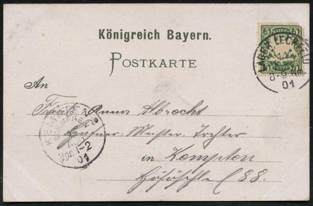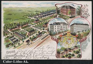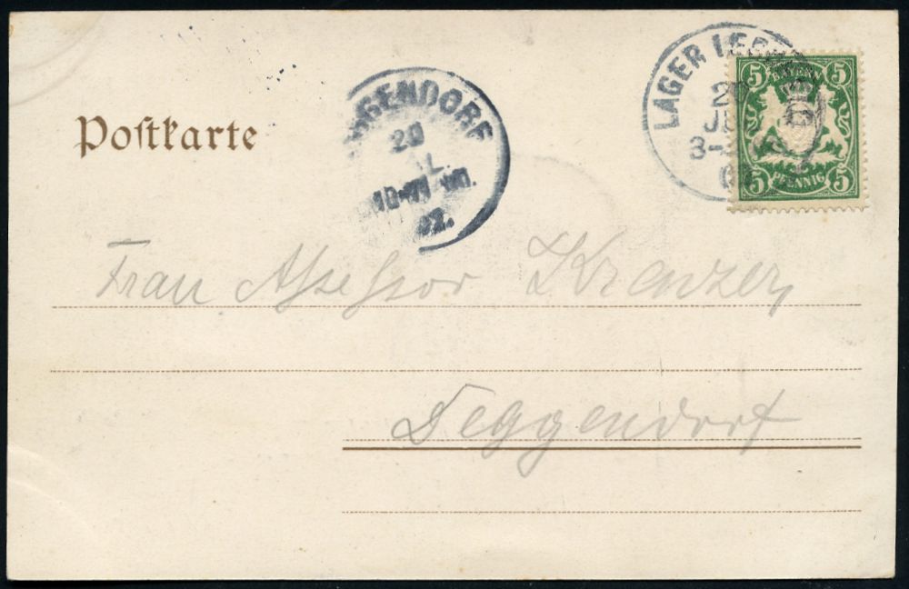 224 | 18 € | TRUPPENÜBUNGSPLÄTZE bis 1918 : LAGER LECHFELD 1901 (14.8.) 1K ohne Bindestrich = Hauspostamt Truppenübungsplatz auf Color-Litho-Ak.: GRUSS AUS LAGER-LECHFELD (4 Ansichten + Wappen) Bedarf n. Kempten, vs. AS. (Uhv. Verlag Wernecker & Farnbacher, Augsburg 1901) | ![]() ![]() | |