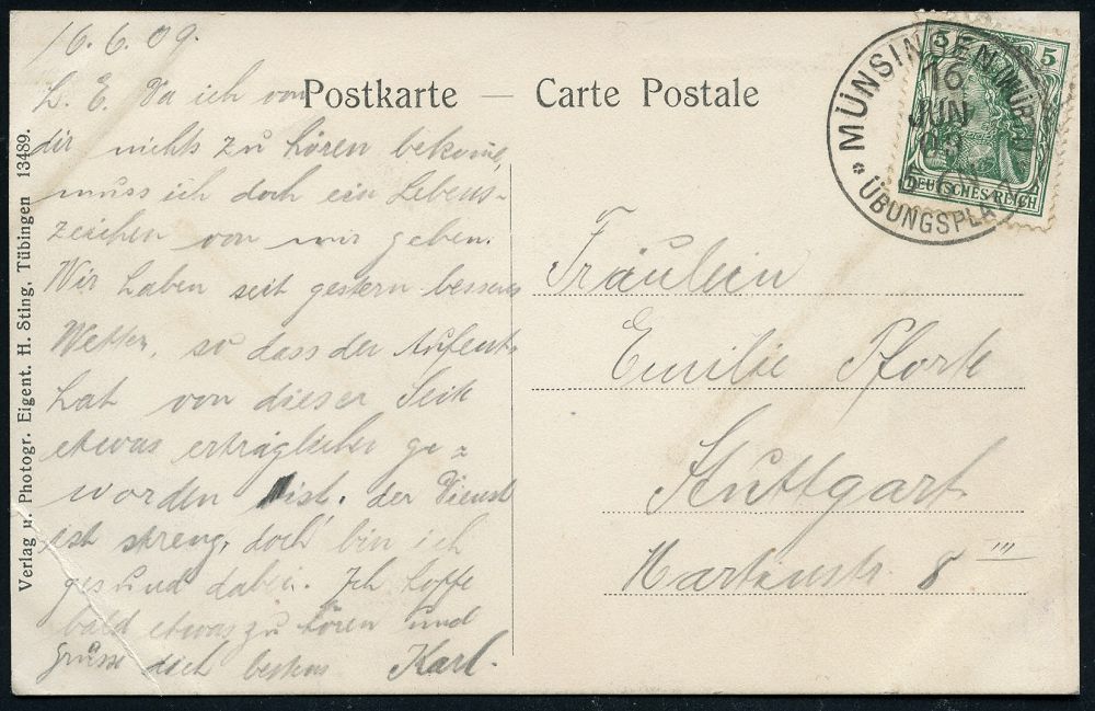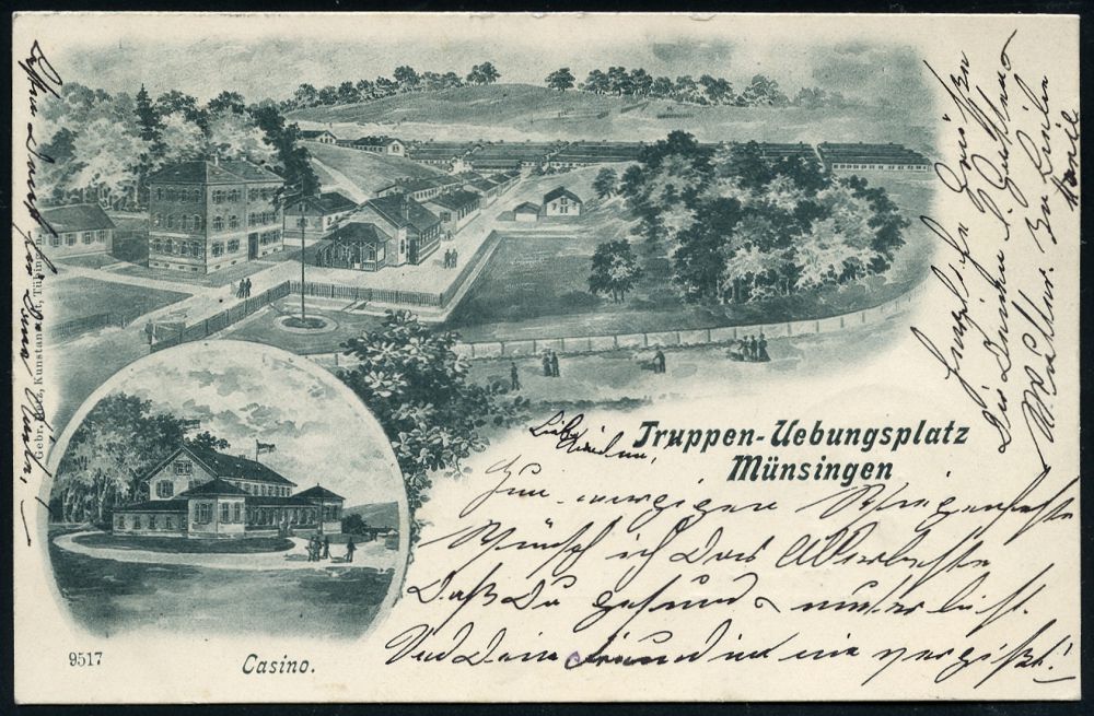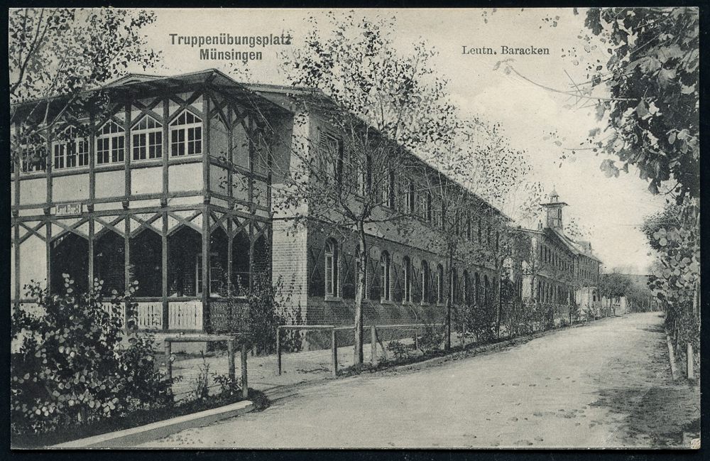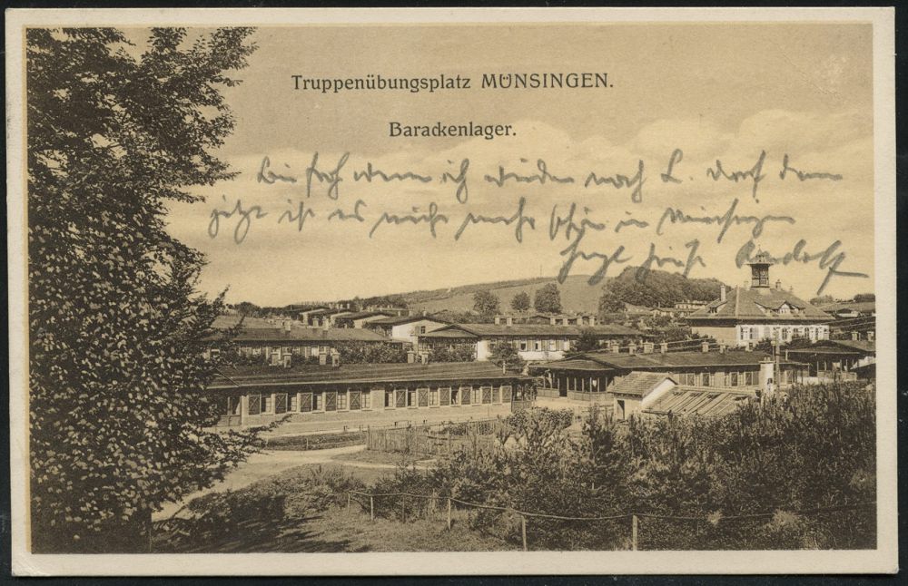 256 | 10 € | TRUPPENÜBUNGSPLÄTZE bis 1918 : MÜNSINGEN (WÜRTT.)/ *ÜBUNGSPLATZ* 1909 (16.6.) 1K = Hauspostamt Truppenübungsplatz auf s/w.-Foto-Ak.: Leutn.(ant)-Baracken n. Stuttgart (Mi.85) | ![]() ![]() | |