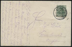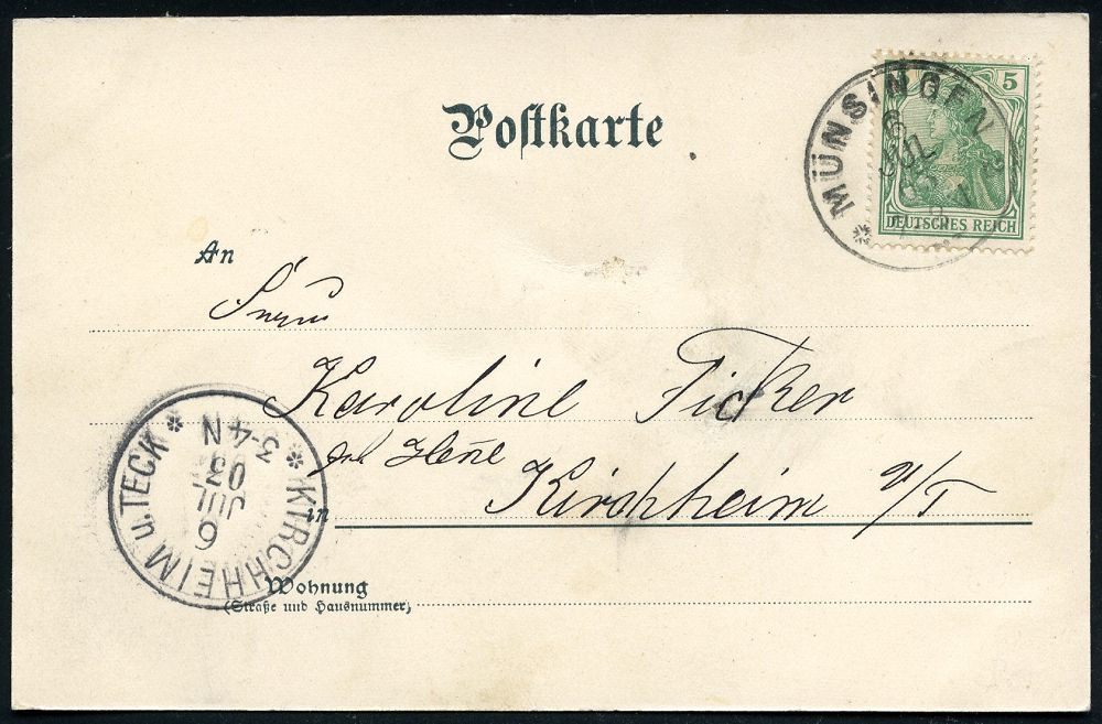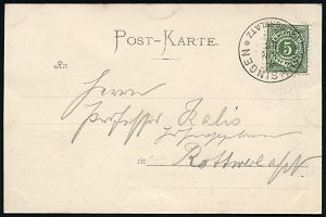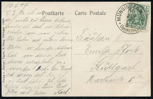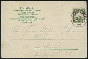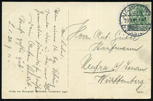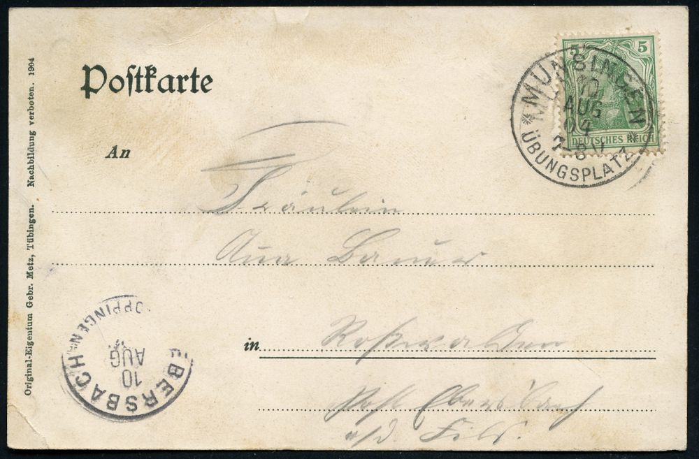 250 | 15 € | TRUPPENÜBUNGSPLÄTZE bis 1918 : MÜNSINGEN/ ** 1903 (6.7.) Orts-1K auf 5 Pf. Germania auf monochromer Color-Litho-Ak.: Truppen-Uebungsplatz Münsingen (2 Ansichten) n. Kirchheim/Teck, vs. AS. (Mi.70) | ![]() ![]() | |