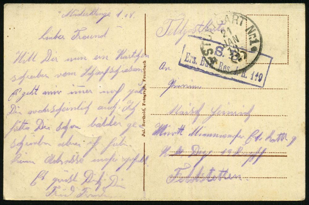 294 | 18 € | TRUPPENÜBUNGSPLÄTZE bis 1918 : Stuttgart-Müderklinge 1918 (21.1.) 1K: STUTTGART Nr.1/b* + viol. Ra.2: .. Ers. Batl. Res. I. R. 149 auf s/w.-Feldpost-Foto-Ak.: Schießplatz Mäderklinge (2 Ansichten) an Militär-Adresse | ![]() ![]() | |