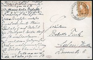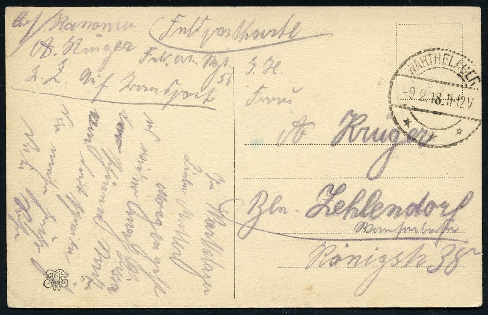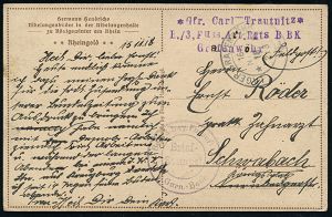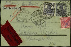 311 | 50 € | TRUPPENÜBUNGSPLÄTZE bis 1918 : WAHN/ (RHEINL.)/ SCHIESSPLATZ 1918 (11.11.) 1K-Brücke 2x auf Kartenbf. 15 Pf. Germania + Zusatz-Frankatur 15 Pf. + 10 Pf. (beim Öffnen getrennt) Fern-Eil-Bf. n. Berlin, dort mit Rohrpost befördert!, vs. 2 verschied. Minuten-1K-Gitter (Berlin C 2 bzw. W 9) Text über Soldatenrat ! = ab 8.11. Waffenstillstand!, sehr seltener Beleg! (Zeitgeschichte!) | ![]() | |