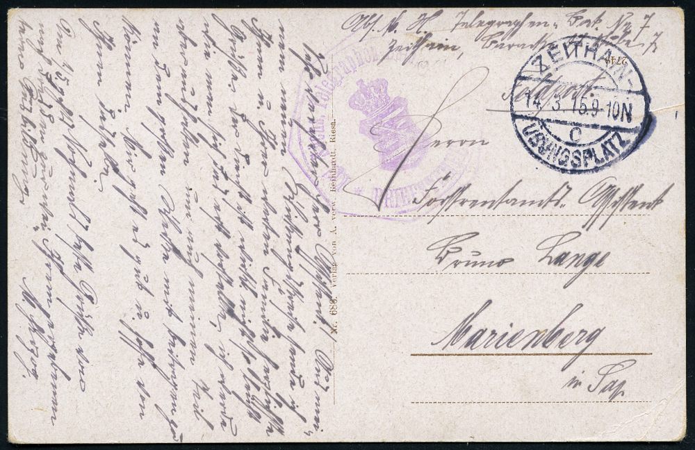 329 | 12 € | TRUPPENÜBUNGSPLÄTZE bis 1918 : ZEITHAIN-/ c/ ÜBUNGSPLATZ 1915 (14.3.) 1K-Brücke mit UB "c" + viol. 1K-HdN: Kgl. Sächs. Telegraphenbau-Bataillon Nr.7 (Wappen) Color-Feldpost-Foto-Ak.: Truppenübungsplatz Zeithain (Schützenreihe) n. Marienberg | ![]() ![]() | |