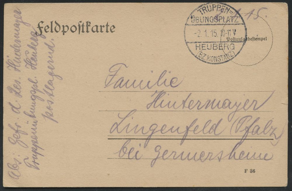 204 | 15 € | TRUPPENÜBUNGSPLÄTZE bis 1918 : HEUBERG/ (BZ.KONSTANZ)/ TRUPPEN=/ ÜBUNGSPLATZ 1915 (Jan./Okt.) je 1K-Brücke ohne UB je klar auf 2 Feldpost-Karten (1x Ak.: Schloß Werenwag), 2 Belege | ![]() ![]() | |