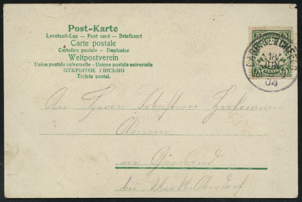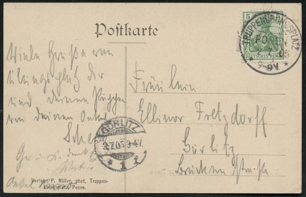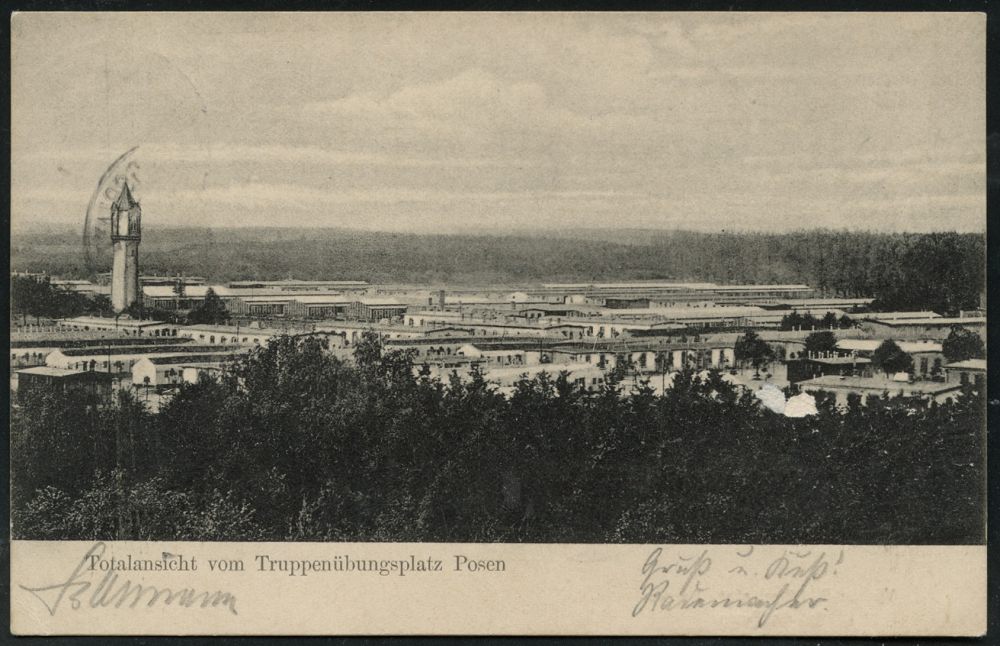 282 | 16 € | TRUPPENÜBUNGSPLÄTZE bis 1918 : POSEN/ TRUPPENÜBUNGSPLATZ/ ** 1905 (2.7.) 1K-Segment = Hauspostamt Truppenübungsplatz klar auf EF 5 Pf. Germania, s/w.-Foto-Ak.: Totalansicht.., Bedarf n. Görlitz, vs. AS. (Uhv.: Verlag P. Müller.. Posen) | ![]() ![]() | |