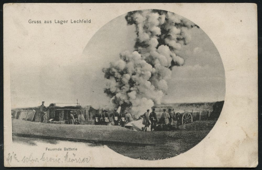 227 | 12 € | TRUPPENÜBUNGSPLÄTZE bis 1918 : LAGER LECHFELD 1907 (24.7.) 1K ohne Bindestrich auf s/w.-Foto-Ak.: Gruss aus Lager Lechfeld, Feuernde Batterie , Bedarf (Uhv.96844 Verlag Ottm. Denzel, Schwabmünchen 1906) | ![]() ![]() | |