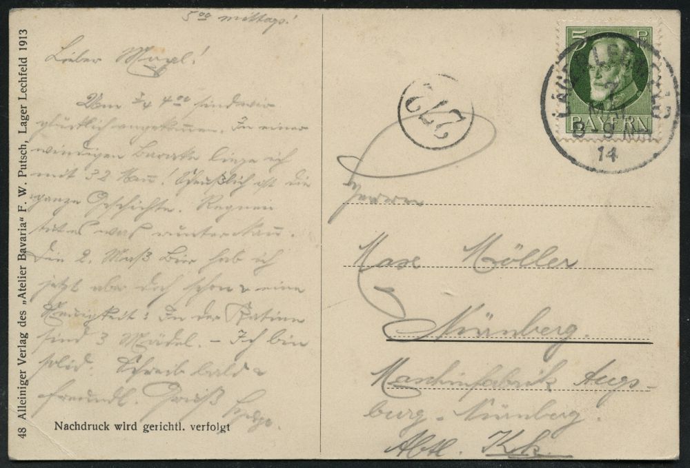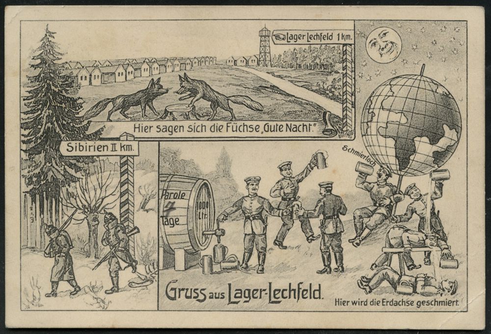 231 | 15 € | TRUPPENÜBUNGSPLÄTZE bis 1918 : LAGER LECHFELD 1914 (7.5.) 1K auf Künstler-Humor-Ak.: Gruss aus Lager-Lechfeld "Hier wird die Erdachse geschmiert" = Bier-Ausgabe (u. 2 Füchse, "Sibirien" etc.) Bedarf n. Nürnberg (Uhv."Atelier Bavaria" F.W. Putsch, Lager Lechfeld 1913) | ![]() ![]() | |