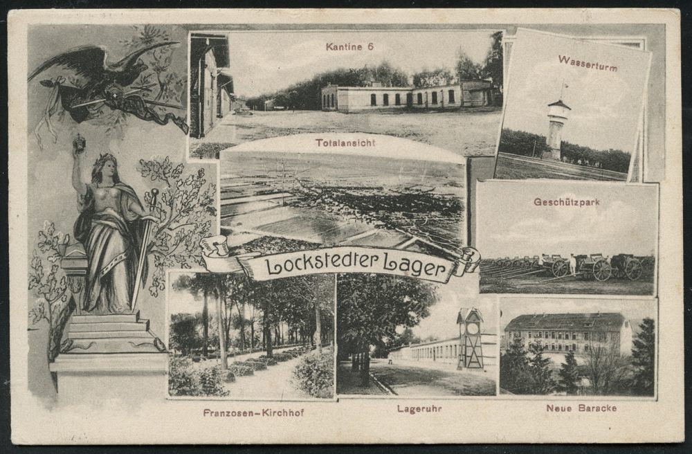 242 | 12 € | TRUPPENÜBUNGSPLÄTZE bis 1918 : LOCKSTEDTER/ LAGER/ *(HOLSTEIN)* 1914 (5.5.) 1K-Gitter auf s/w.-Foto-Künstler-Ak.: Lockstedter Lager (7 Ansichten inkl. Franzosen-Kirchhof u. Lageruhr etc. + Germania u. Adler) (Uhv. Verlag Vahlendick, Kellinghusen) | ![]() ![]() | |