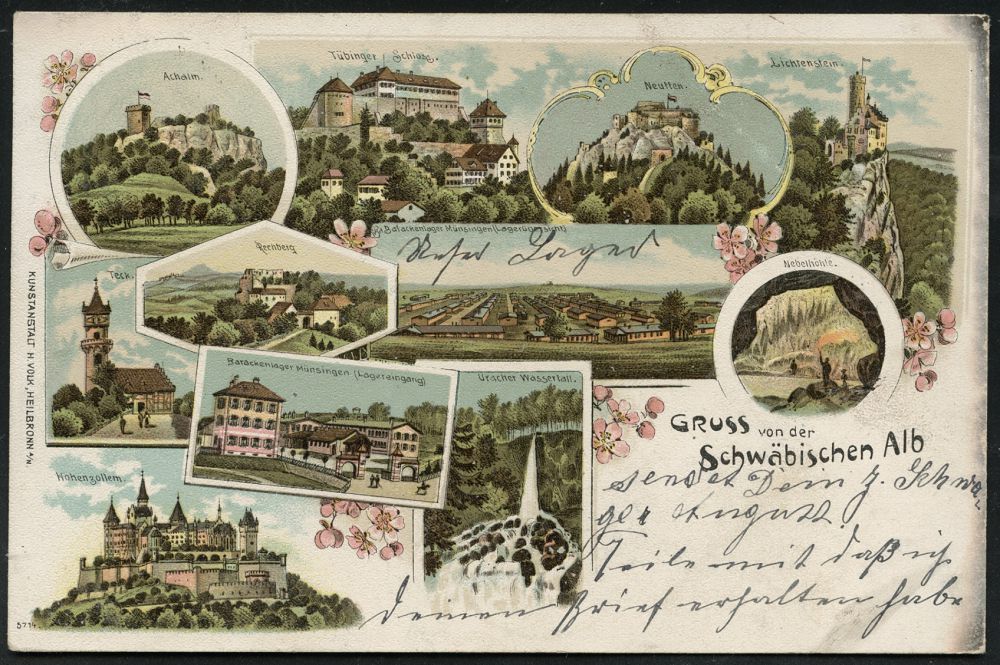 252 | 18 € | TRUPPENÜBUNGSPLÄTZE bis 1918 : MÜNSINGEN/ *ÜBUNGSPLATZ* 1906 (23.6.) 1K auf EF 5 Pf. Germania auf Colot-Litho-Ak.: GRUSS von der Schwäb. Alb, 2x Lager Münsingen + 9 weitere Ansichten u.a. Hohenzollernburg, Tübinger Schloss, Nebelhöhle u.a., Bedarf n. Ffm., vs. AS. (Uhv.: KUNSTANSTALT H. VOLK, HEILBRONN) | ![]() ![]() | |