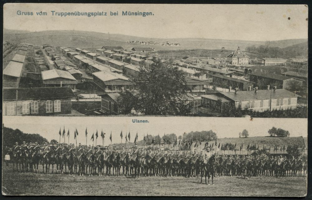 255 | 10 € | TRUPPENÜBUNGSPLÄTZE bis 1918 : MÜNSINGEN (WÜRTT.)* a 1908 (31.7.) 1K auf EF 5 Pf. Germania, s/w.-Foto-Ak.: Gruss vom Truppenübungsplatz bei Münsingen (2 Ansichten: Barackenlager u. Ulanen in Schlachtaufstellung, Bedarf | ![]() ![]() | |