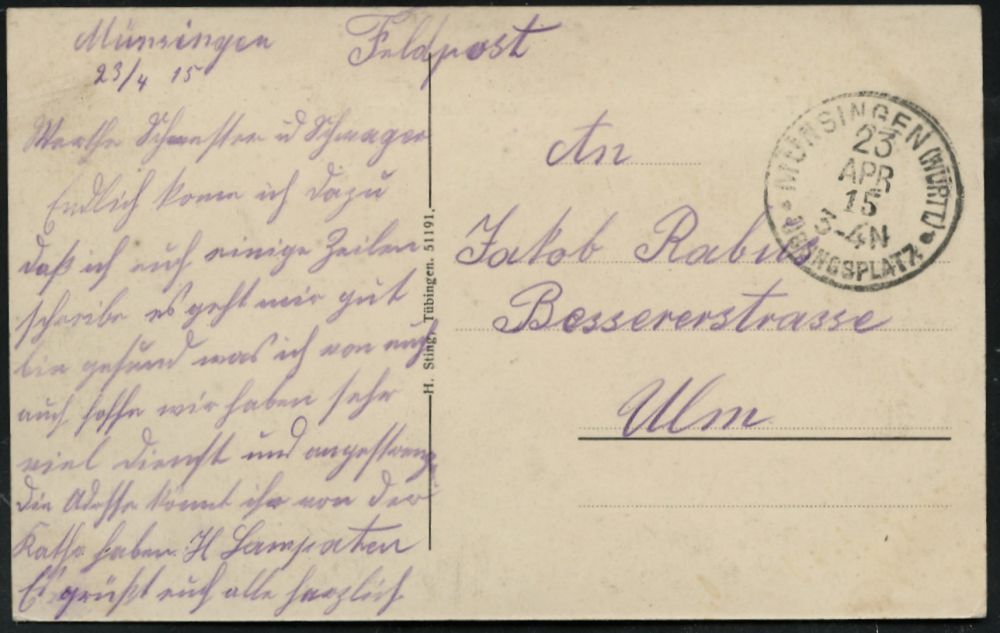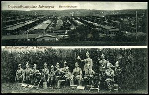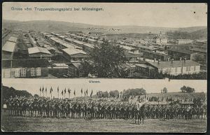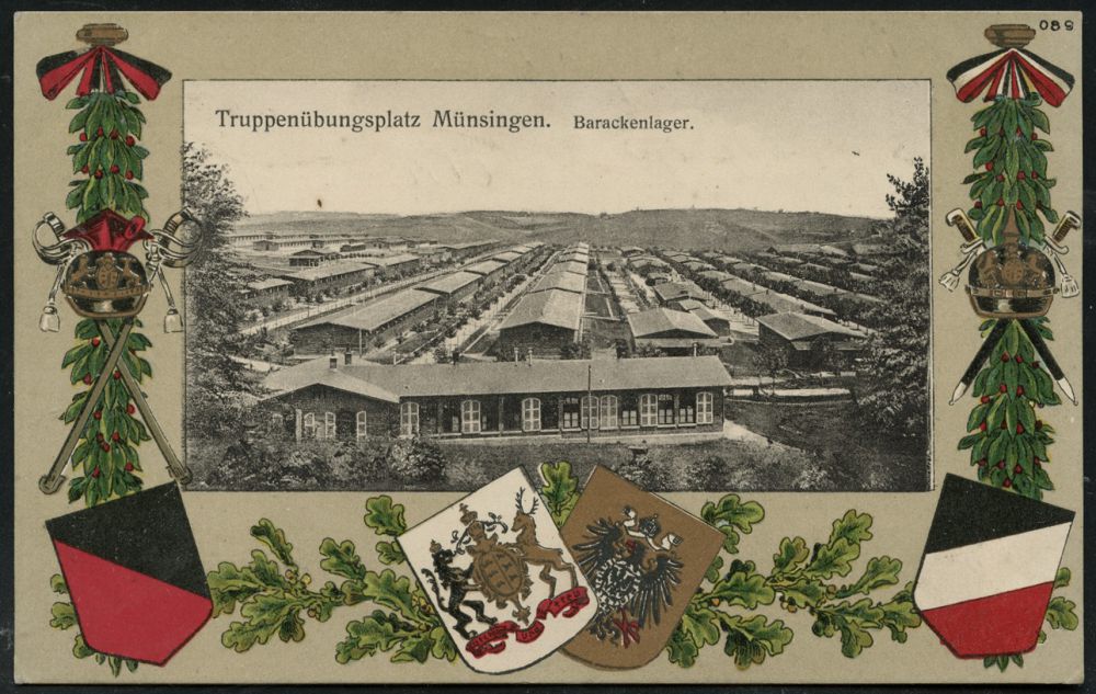 261 | 15 € | TRUPPENÜBUNGSPLÄTZE bis 1918 : MÜNSINGEN (WÜRTT.)/ ° ÜBUNGSPLATZ ° 1915 (23.4.) 1K mit 2 vollen Punkten (ehem. Stern) = Hauspostamt Truppenübungsplatz auf Color-Litho-Ak. mit s/w.-Foto-Ansicht: Barackenlager (u. farbigen Wappen u. Waffen, Pickel- u. Ulanenhaube) , Feldpost-Kt. n. Ulm (Uhv. H. Sting, Tübingen 51191) | ![]() ![]() | |