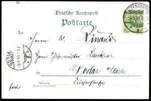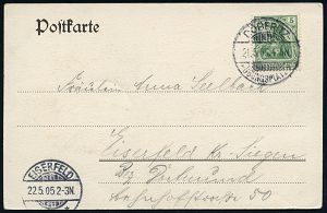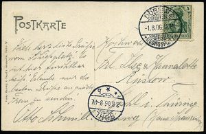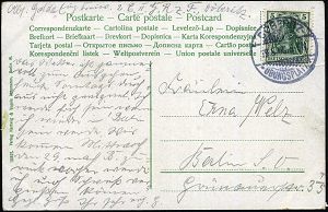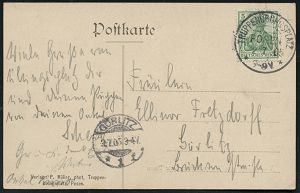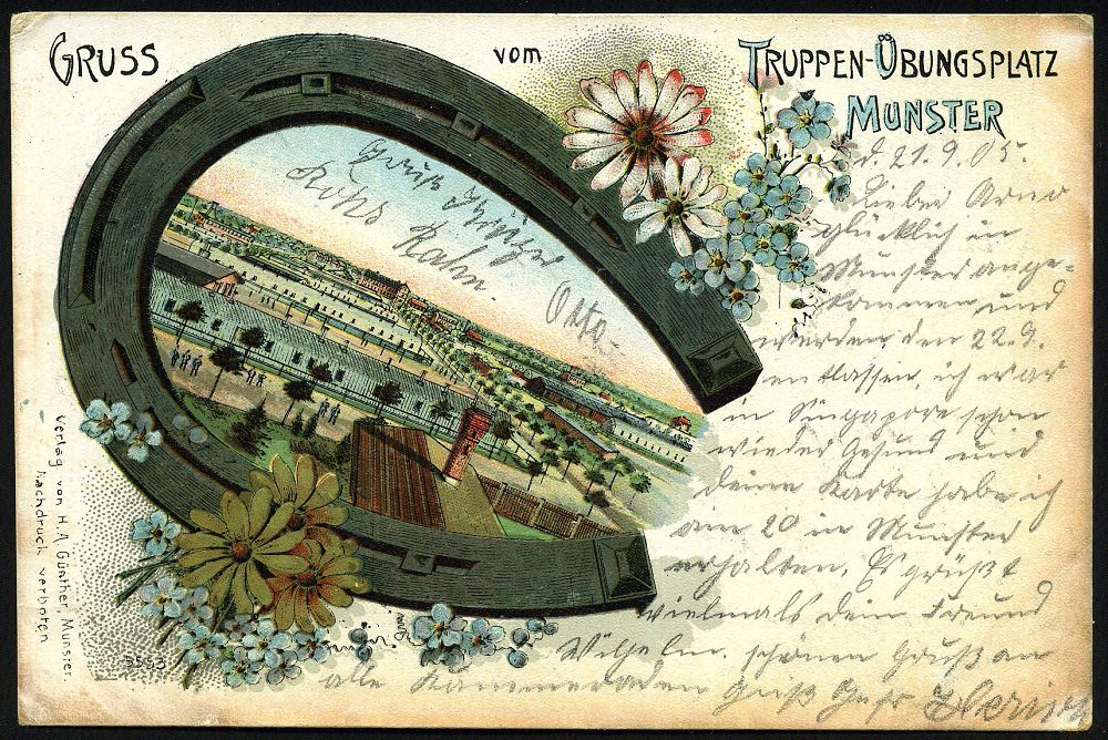 264 | 28 € | TRUPPENÜBUNGSPLÄTZE bis 1918 : MUNSTERLAGER/ (BZ.HANNOVER) 1905 (9.5.) 1K-Gitter = Hauspostamt Truppenübungsplatz klar auf Color-Litho-Ak.: GRUSS vom TRUPPEN-ÜBUNGSPLATZ MUNSTER (Lager mit Hufeisen etc.) + 1K: BERLIN C./1/MARINE-/POSTBUREAU/**, Übersee-Kt. n. Tsingtau an die "3. (berittene) Comp. Ost-Asiat. Jnf. Regt. No.1" in Lyfang, vs. AS., seltene Destination! | ![]() ![]() | |