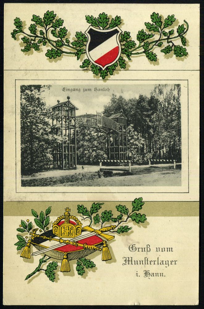 265 | 12 € | TRUPPENÜBUNGSPLÄTZE bis 1918 : MUNSTER/ *(LAGER)* 1915 (14.5.) 1K-Brücke = Hauspostamt Truppenübungsplatz klar auf Color-Feldpost-Ak.: Gruß vom Munsterlager.. (Eichenlaub, Krone, Szepter, Schwert etc.) + s/w.-Foto: Foto zum Hanloh n. Oeringen (Uhv. Verlagsanstalt "Kosmos", Halberstadt Nr.8221) | ![]() ![]() | |