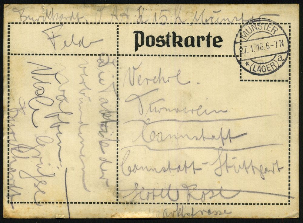 266 | 16 € | TRUPPENÜBUNGSPLÄTZE bis 1918 : MUNSTER/ *(LAGER)/ a 1916 (27.1.) 1K-Brücke mit UB "a" klar auf seltener Künstler-Feldpost-Ak.: 15. Comp. Offz. Asp. Ausb. Lehrg. (Jäger, Matrose, Infanterist) sign. S - F. n. Cannstatt (o. Uhv.) | ![]() ![]() | |