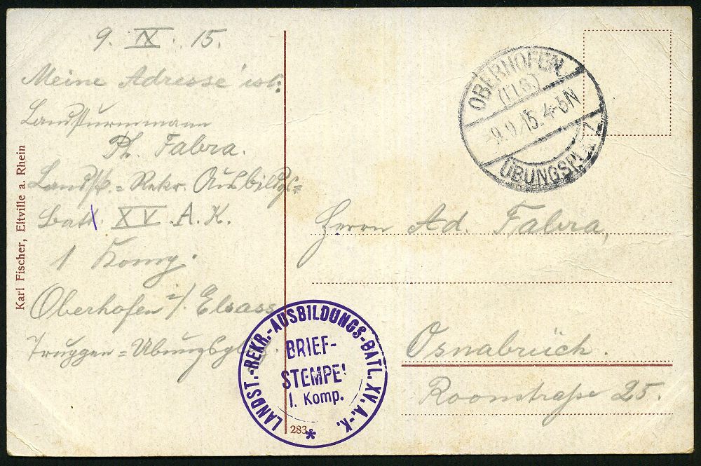 276 | 12 € | TRUPPENÜBUNGSPLÄTZE bis 1918 : OBERHOFEN/ (ELS.)/ ÜBUNGSPLATZ 1915 (9.9.) 1K-Brücke = Hauspostamt Truppenübungsplatz + viol. 1K-HdN: LANDST.(URM) REKR.-AUSBILDUNGS-BATL. XV. A. K. + hs. Abs., klar gest. Feldpost-Foto-Ak. (Niederwald-Denkmal) n. Osnabrück | ![]() ![]() | |