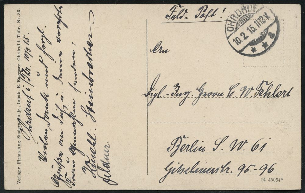 281 | 18 € | TRUPPENÜBUNGSPLÄTZE bis 1918 : OHRDRUF/ **a #bzw.# OHRDRUF/ *** 1915/17 je 1K-Brücke auf Color-Foto-Ak.: Kaiserstraße mit Ulanen bzw. s/w.-Foto-Ak.: Teilansicht v. Truppenlager Ohrdruf , je klar gest. Feldpost-Kt. (Einzelverkauf möglich: je 10.- EUR), 2 Belege | ![]() ![]() ![]() ![]() | |