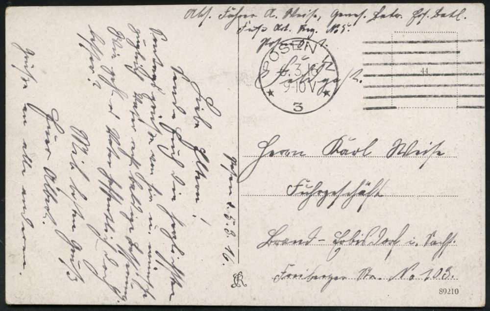 285 | 16 € | TRUPPENÜBUNGSPLÄTZE bis 1918 : POSEN W/ * 3 * ^1916 (6.3.) Maschinen-StrichStpl. (7 waager. Linien rechts, teils gebrochen) + hs. Abs.: "..Fuß Art. Reg. No.5..", klar gest. s/w.-Feldpost-Foto-Ak.: POSEN, Fort Grolman, Fort Rauch (2 Ansichten) (Uhv. L R) | ![]() ![]() | |