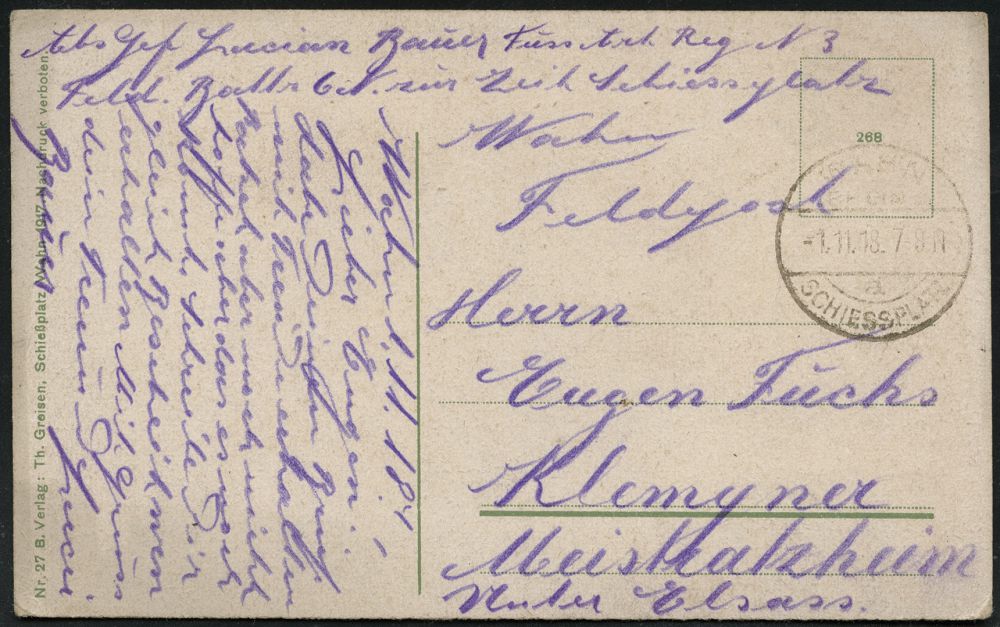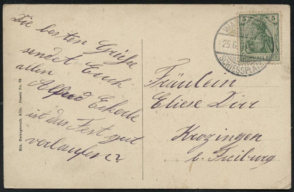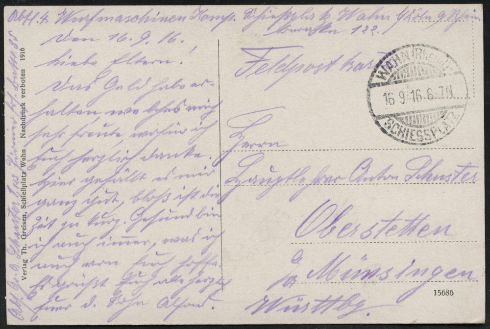 305 | 14 € | TRUPPENÜBUNGSPLÄTZE bis 1918 : WAHN (Rheinl.)-/ SCHIESSPLATZ 1916 (16.9.) 1K-Gitter + interessanter, hs. Abs.: "..Wurfmaschinen Komp.Schießplatz Wahn.." , klar gest. Color-Foto-Feldpost-Ak.: Gruß vom Schießplatz Wahn (8 Ansichten) n. Oberstetten (Uhv.: Verlag Th. Greisen, Schießplatz Wahn.. 1916) | ![]() ![]() | |