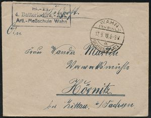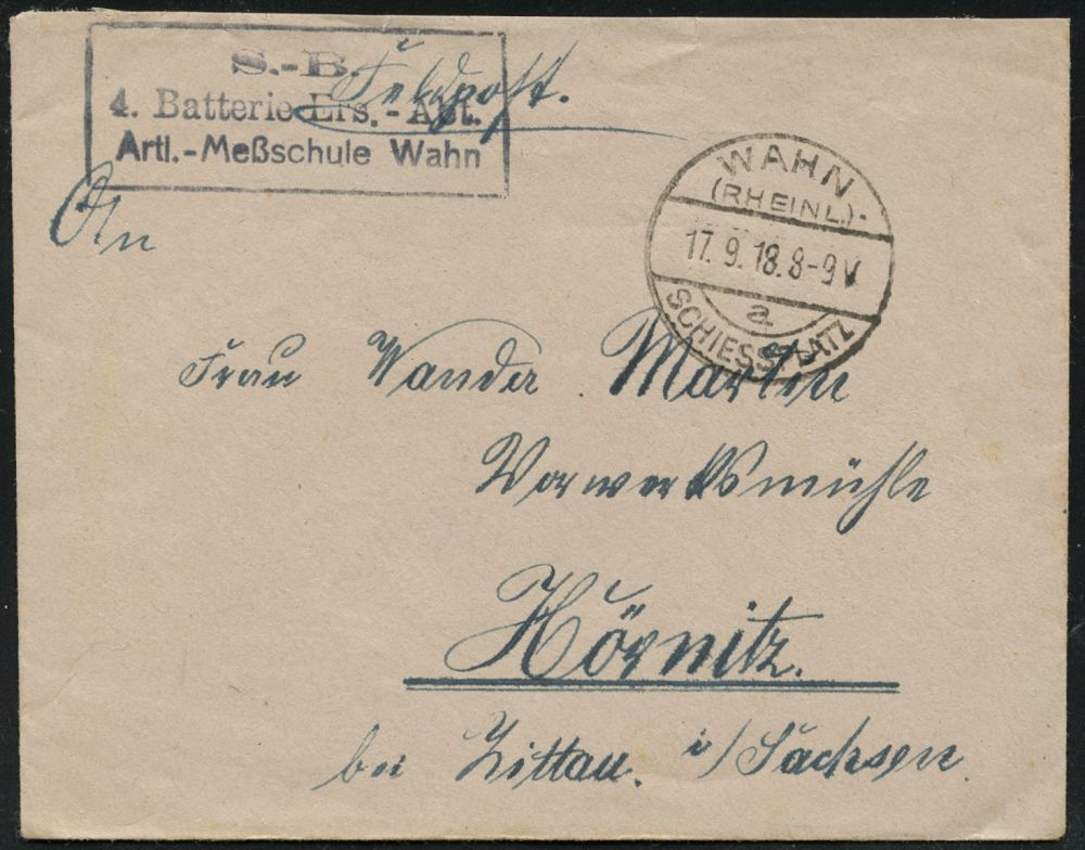 308 | 15 € | TRUPPENÜBUNGSPLÄTZE bis 1918 : WAHN/ (RHEINL.)-/ a/ SCHIESSPLATZ 1918 (17.9.) 1K-Brücke mit UB "a" + viol. Ra.3: ..4. Batterie Ers.-Abt./ Artl.- M e ß s c h u l e Wahn + rs. hs. Abs., klar gest. kleiner Feldpost-Bf. n. Hörnitz | ![]() | |