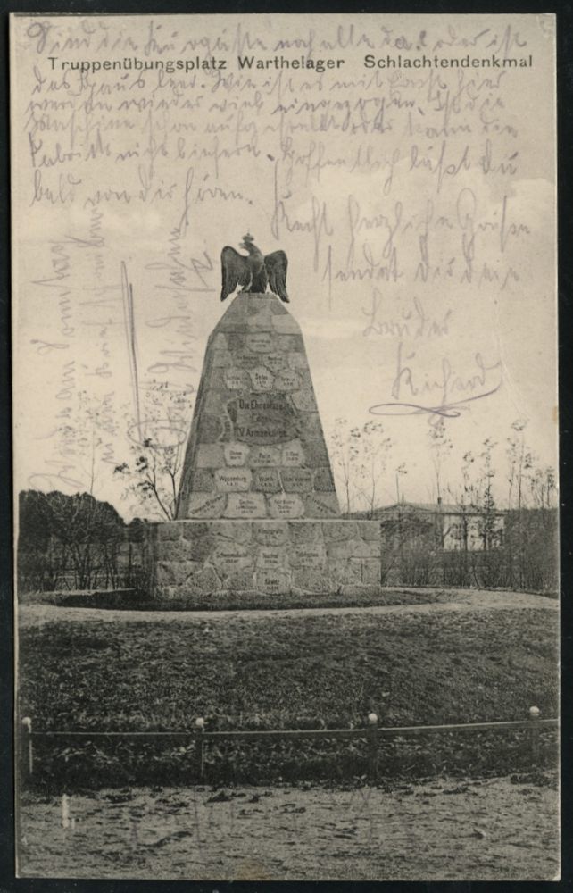 316 | 14 € | TRUPPENÜBUNGSPLÄTZE bis 1918 : WARTHELAGER/ TRUPPEN=/ ÜBUNGSPLATZ 1916 (4.6.) 1K-Brücke + hs. Abs. auf s/w.-Foto-Feldpost-Ak.: Warthelager Schlachtendenkmal (Ehrenmal des V. Armeekorps) zum Krieg 1870-71 | ![]() ![]() | |