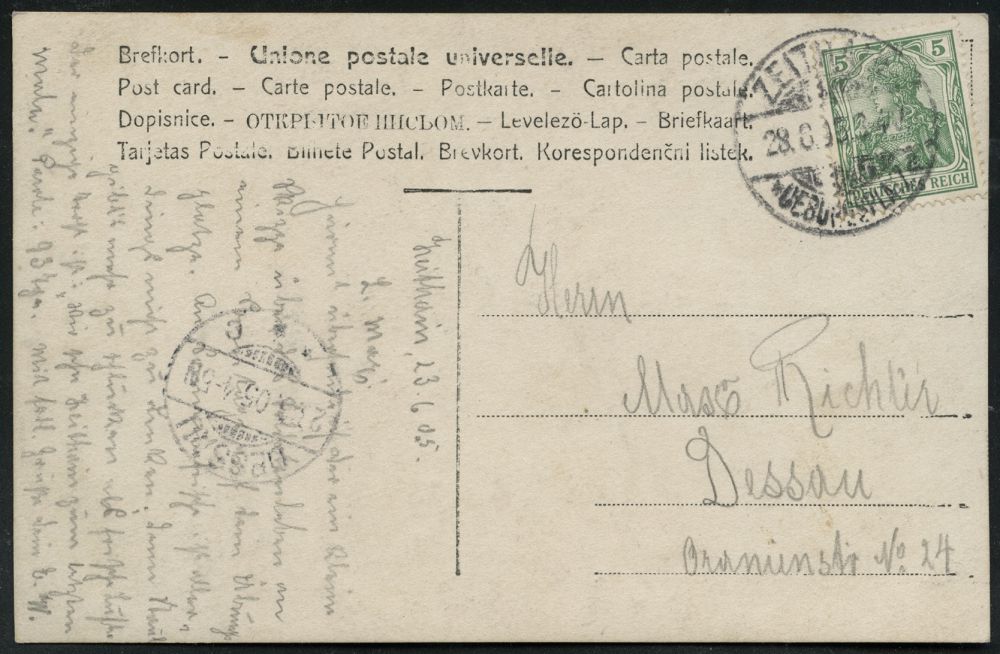 321 | 18 € | TRUPPENÜBUNGSPLÄTZE bis 1918 : Zeithain 1900 (14.6.) Color-Litho-Ak.: Truppen-Übungsplatz Zeithain mit 4 Detail-Ansichten , 1K: LEIPZIG-GOHLIS, klar gest. Fern-Kt. n. Burg, vs. AS. (Uhv. Verlag Reinhardt, Riesa) | ![]() ![]() | |