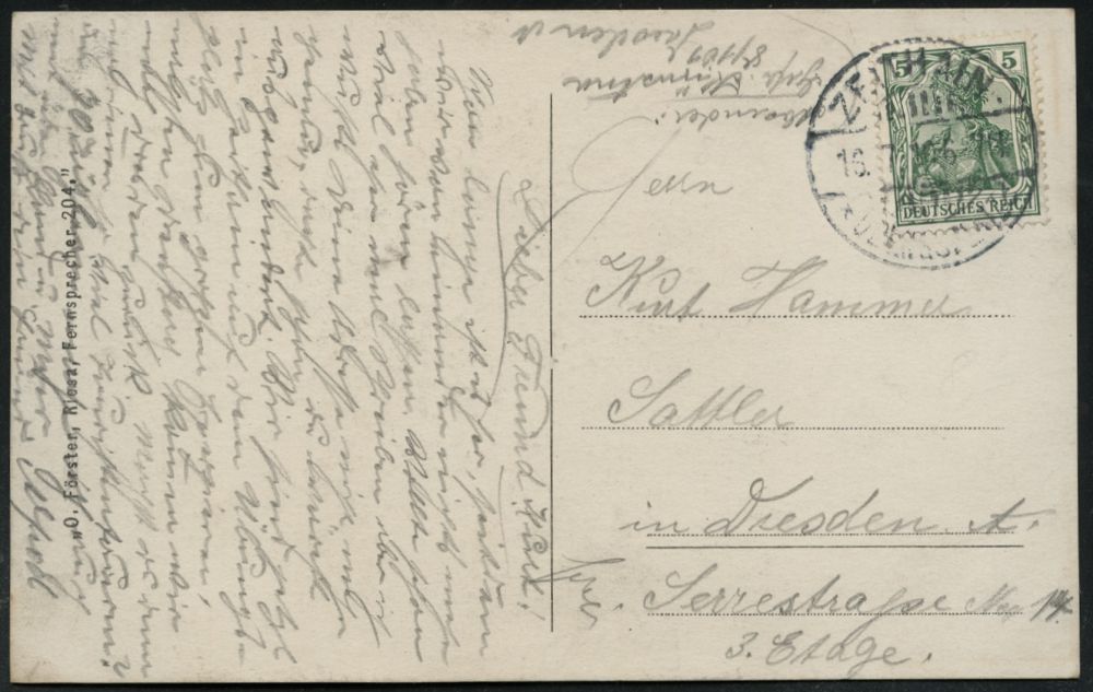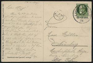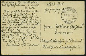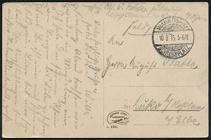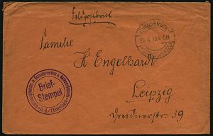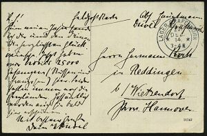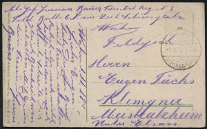 328 | 10 € | TRUPPENÜBUNGSPLÄTZE bis 1918 : ZEITHAIN-/ c/ ÜBUNGSPLATZ 1914 (30.9.) 1K-Brücke mit UB "c" + hs. Abs.: ".. Reserve-Lazarett B.." , relativ frühe Feldpost-Kt. (2. Kriegs-Monat) n. Bln-Schlachtensee | ![]() | |
