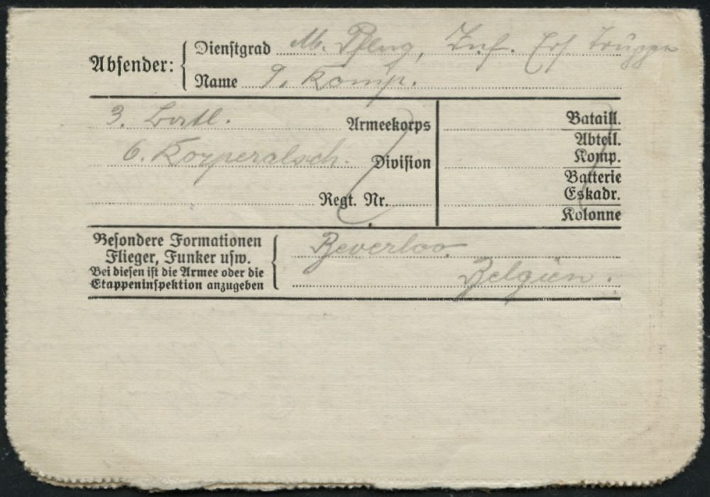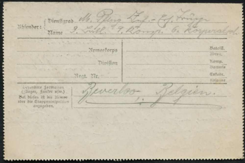 335 | 20 € | TRUPPENÜBUNGSPLÄTZE bis 1918 : DT.BES.BELGIEN 1916 (17.2./20.2.) 2x 1K-Brücke: BEVERLOO/TRUPPENPLATZ/(BELGIEN) + viol. Ra.3: .. 6./III B. Jnf. Ers. Truppe/ Beverloo bzw. ..9./III. Jnf. Ers. Truppe/ Beverloo , je klar gest. Feldpost-Falt-Bf. mit Inhalt (je rs. hs. Abs.) n. Wiesbaden, 2 Belege | ![]() ![]() ![]() ![]() | |