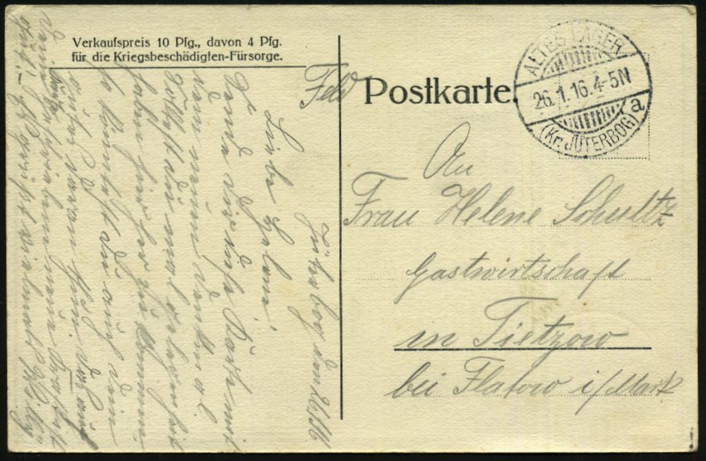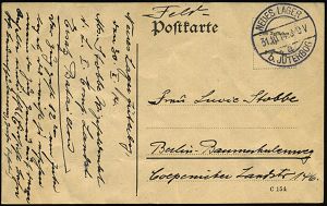 210 | 10 € | TRUPPENÜBUNGSPLÄTZE bis 1918 : Jüterbog 1914 (31.10.) 1K-Brücke: NEUES LAGER/a/b. JÜTERBOG = Hauspostamt Truppen-Übungsplatz + hs. Abs. (Landsturm) klar gest. Feldpost-Vordr.-Kt. aus dem 3. Kriegs-Monat n. Berlin | ![]() | |
