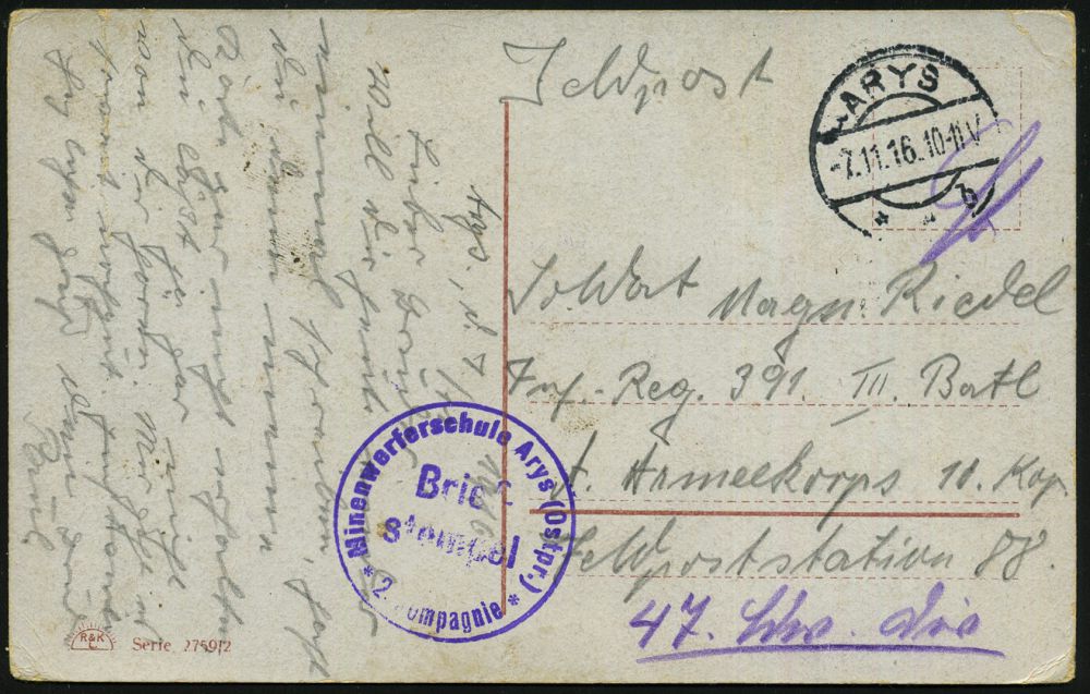163 | 18 € | TRUPPENÜBUNGSPLÄTZE bis 1918 : ARYS/ **b 1916 (Okt./Nov.) 1K-Brücke je auf 2 Feldpost-Ak.: 1x Pioniere, 1x Kitsch, 1x viol. 1K-HdN: Minenwerferschule Arys (Ostpr.)/ 2. Compagnie (Bugspur) klar gest., 2 Belege | ![]() ![]() | |