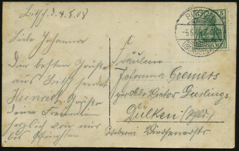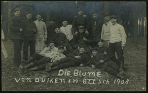 165 | 12 € | TRUPPENÜBUNGSPLÄTZE bis 1918 : BITSCH/ ÜBUNGSPLATZ 1908 (5.5.) 1K-Gitter auf individueller Foto-Ak.: Die Blume von Dülken in Bitsch 1908 (Soldaten, teils mit Porzellanpfeifen) ohne Uhv. (anschriftenseitig schwach fleckig), Bedarfs-Kt. (b. Dülken/Rhld.) | ![]() ![]() | |