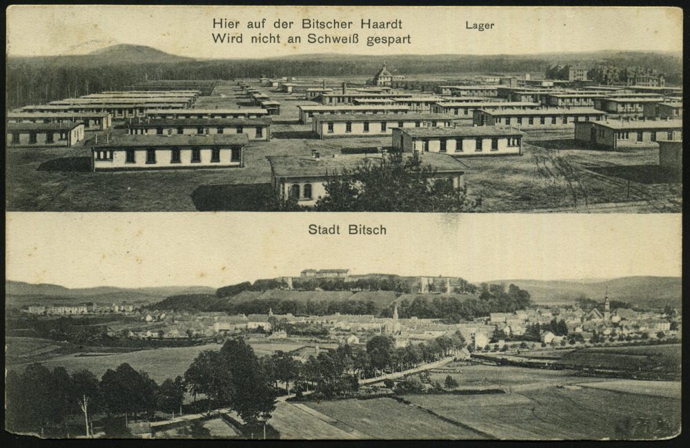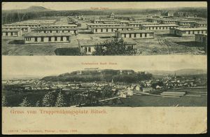 166 | 18 € | TRUPPENÜBUNGSPLÄTZE bis 1918 : Bitsch Übungsplatz 1908/10 2 verschiedene s/w.-Foto-Ak.: Bitsch Lager / Stadt Bitsch (je 2 Ansichten) 1x K-Gitter: BITSCH/***, 1x 1K-Gitter: BITSCH/ÜBUNGSPLATZ (unten undeutl.) 2 Bedarfs-Karten (je Mi.85) | ![]() ![]() ![]() ![]() | |